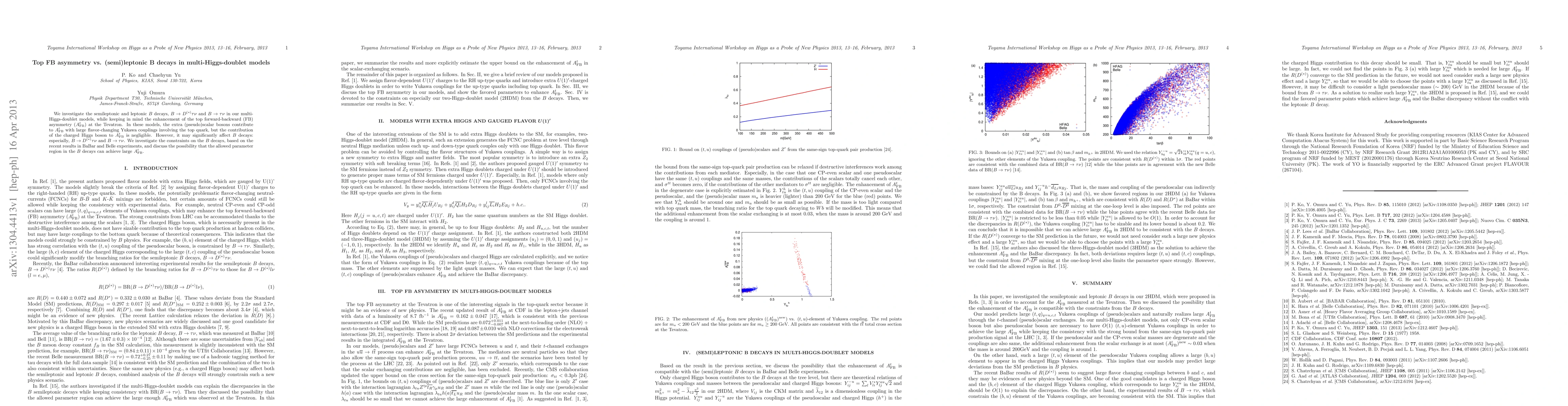 This paper explores semileptonic and leptonic B decays in multi-Higgs-doublet models, focusing on the impact of extra (pseudo)scalar bosons on the top forward-backward asymmetry. It finds that while the charged Higgs contribution to the asymmetry is negligible, it can significantly affect B decays, with implications for recent BaBar and Belle experimental results.