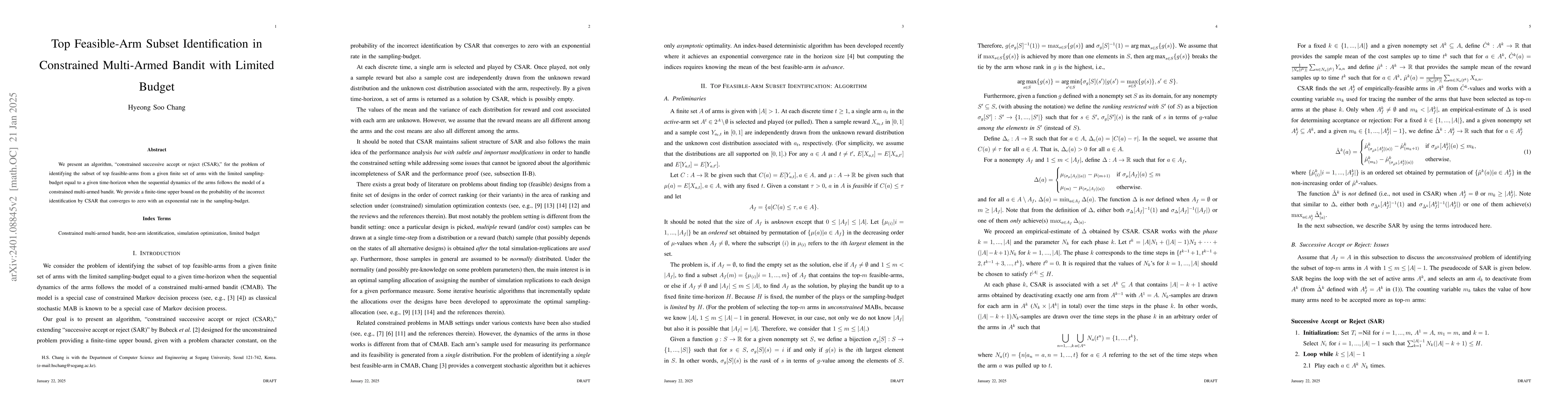 This paper proposes a constrained successive accept or reject (CSAR) algorithm to identify the top feasible-arms in constrained multi-armed bandit problems. The algorithm's performance is analyzed, showing an exponentially decreasing upper bound on the probability of incorrect identification as time increases.
