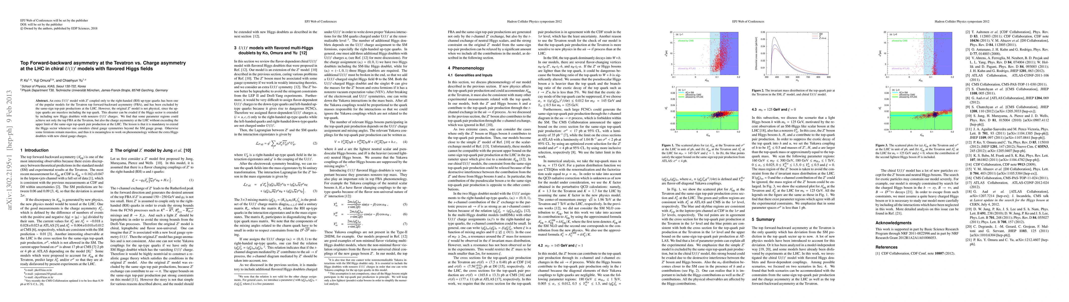 This paper explores chiral $U(1)'$ models with flavored Higgs fields to explain the top forward-backward asymmetry at the Tevatron and the charge asymmetry at the LHC. The study finds that extending the Higgs sector with new doublets can reconcile these phenomena without violating LHC constraints on same-sign top-pair production.