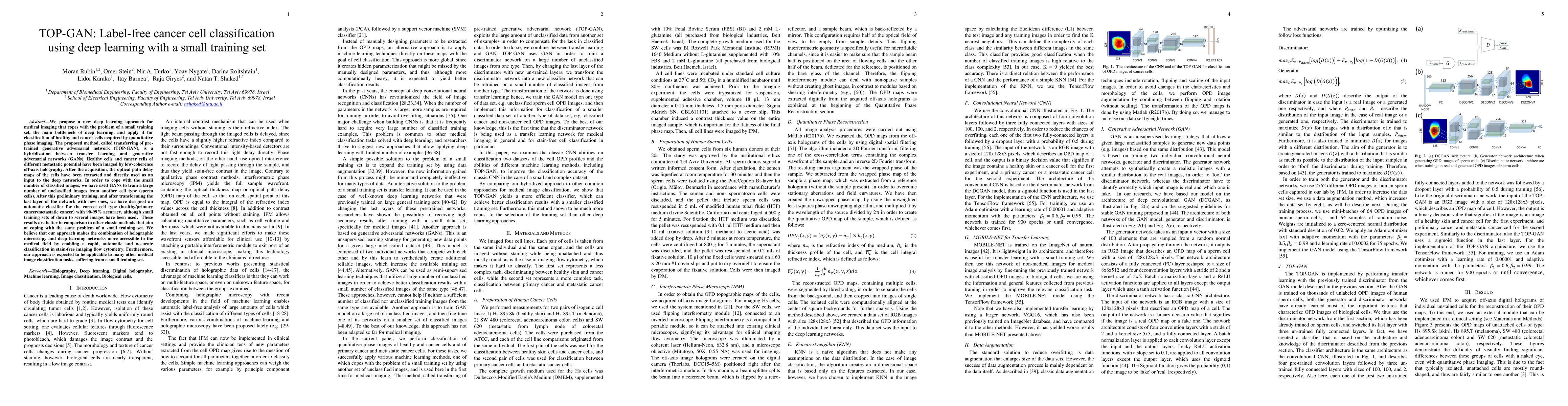 The paper proposes a novel deep learning method called TOP-GAN that combines transfer learning and GANs to classify cancer cells from quantitative phase imaging with a small training set. The method achieves high accuracy (90-99%) even with minimal training images, outperforming traditional methods and potentially enhancing stain-free imaging flow cytometry.