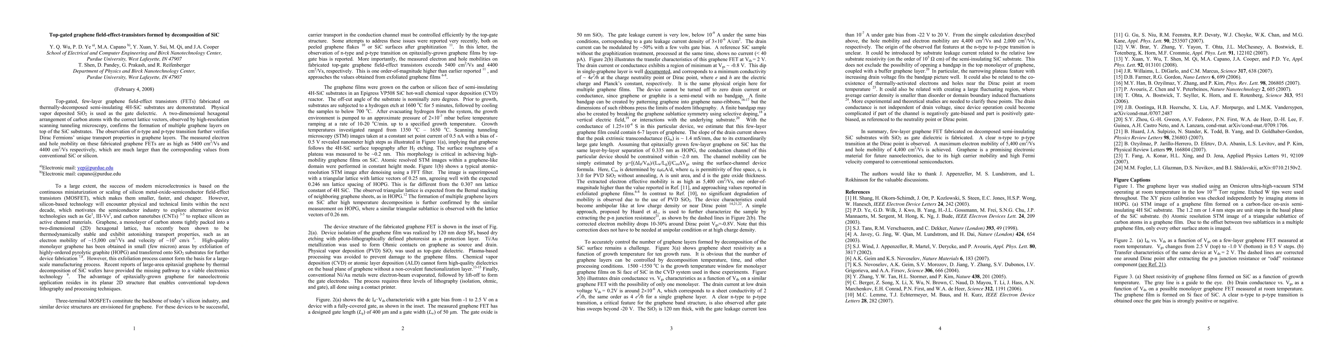 This research demonstrates the fabrication of top-gated, few-layer graphene FETs using thermally decomposed 4H-SiC substrates with SiO2 as the gate dielectric, showing high electron and hole mobility and confirming the presence of Dirac Fermions through n-type and p-type transitions.