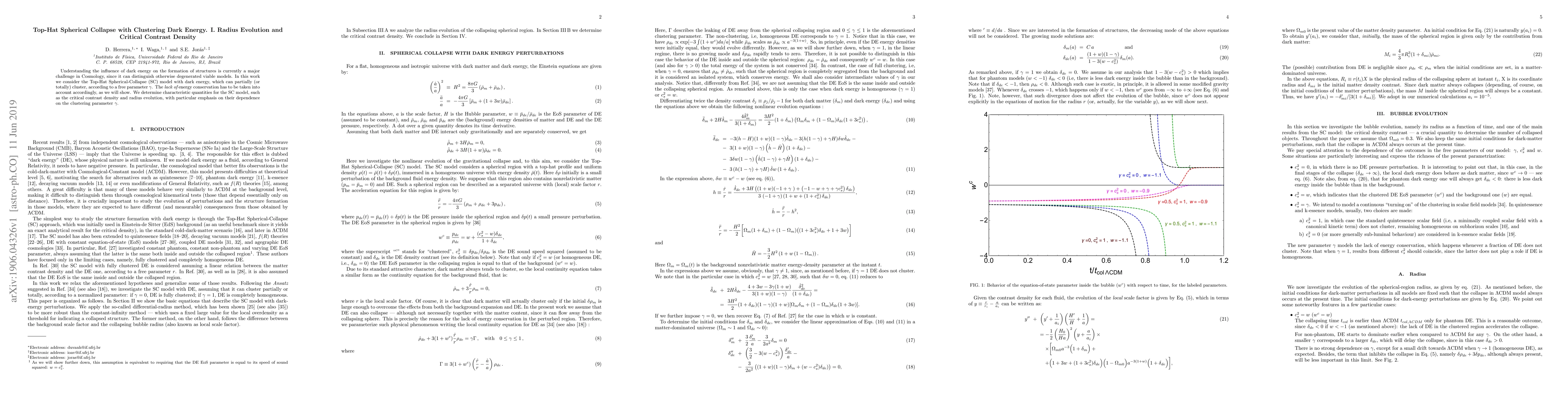 Understanding the influence of dark energy on the formation of structures is currently a major challenge in Cosmology, since it can distinguish otherwise degenerated viable models. In this work we consider the Top-Hat Spherical-Collapse (SC) model with dark energy, which can partially (or totally) cluster, according to a free parameter $\gamma$. The {\it lack of} energy conservation has to be taken into account accordingly, as we will show. We determine characteristic quantities for the SC model, such as the critical contrast density and radius evolution, with particular emphasis on their dependence on the clustering parameter $\gamma$.