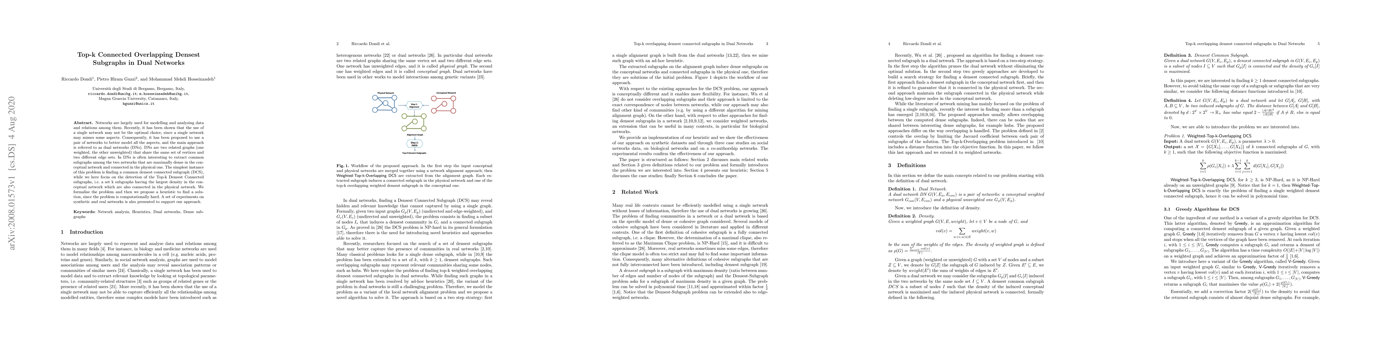 This paper addresses the problem of identifying the Top-k densest connected overlapping subgraphs in dual networks, which consist of two related graphs sharing the same vertices but different edge sets. The authors propose a heuristic approach to solve this computationally challenging problem and validate their method through experiments on both synthetic and real-world networks.