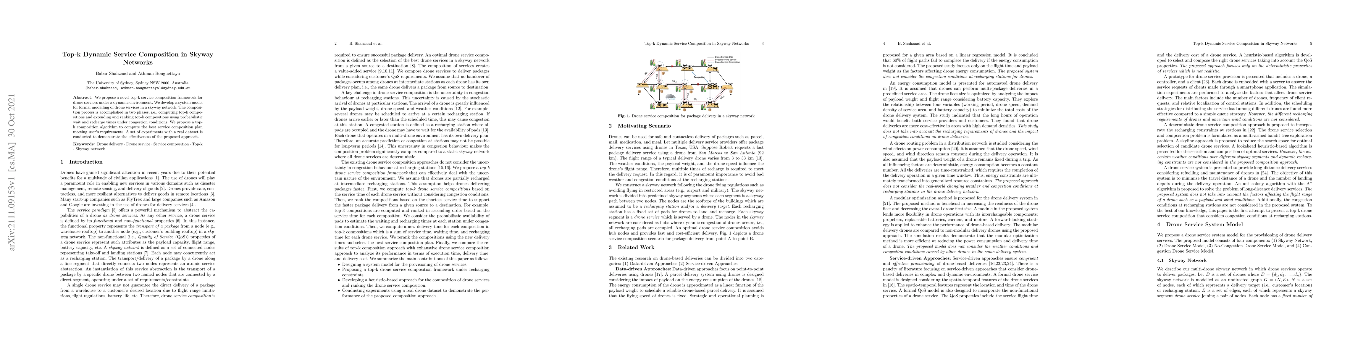We propose a novel top-k service composition framework for drone services under a dynamic environment. We develop a system model for formal modelling of drone services in a skyway network. The composition process is accomplished in two phases, i.e., computing top-k compositions and extending and ranking top-k compositions using probabilistic wait and recharge times under congestion conditions. We propose a top-k composition algorithm to compute the best service composition plan meeting user's requirements. A set of experiments with a real dataset is conducted to demonstrate the effectiveness of the proposed approach.