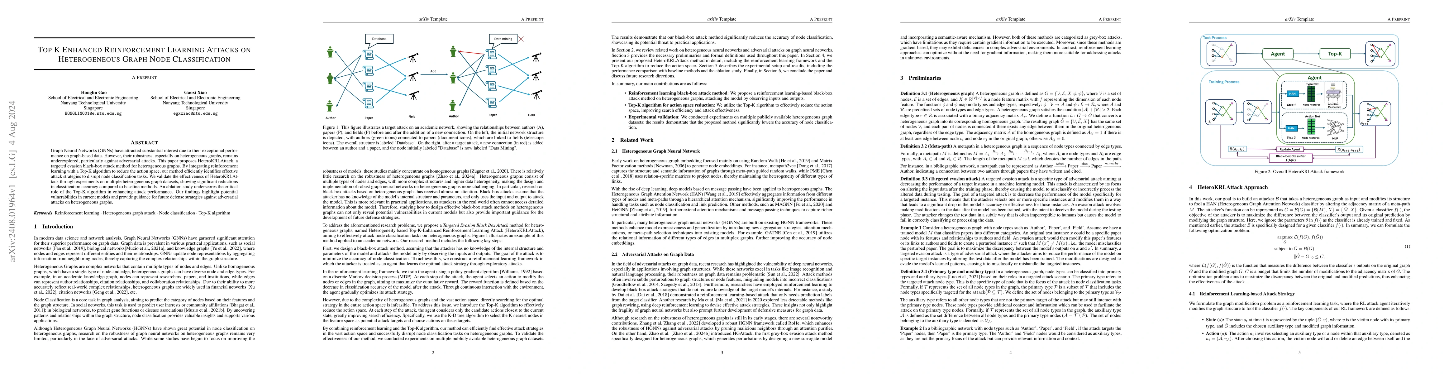 This paper proposes HeteroKRLAttack, a reinforcement learning-based evasion attack method for heterogeneous graphs, which uses a Top-K algorithm to efficiently identify effective attack strategies, significantly reducing node classification accuracy. Experiments show its superiority over baseline methods, underscoring the vulnerability of current graph neural network models.
