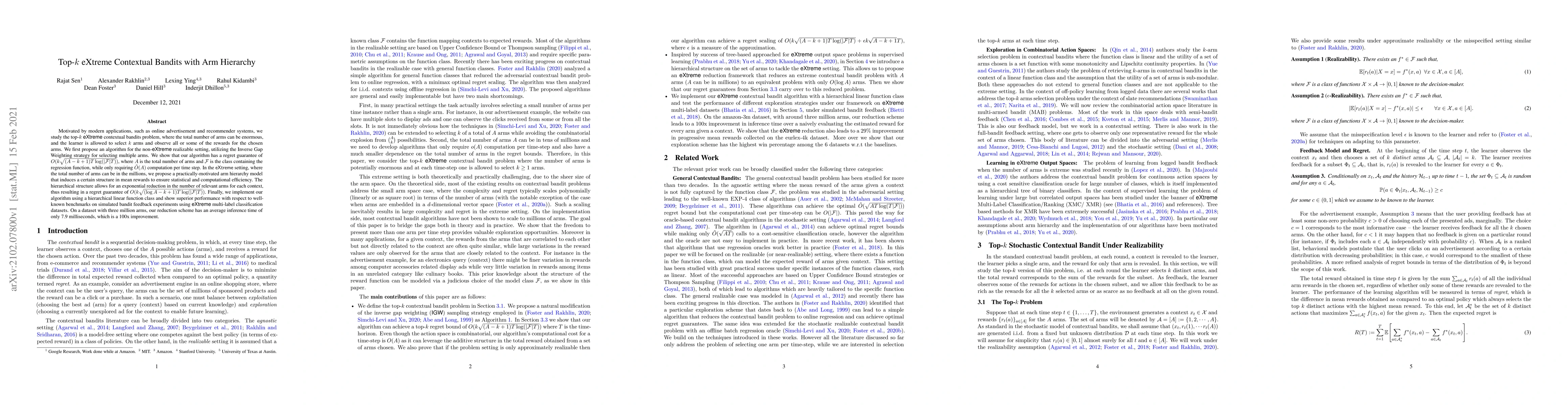 A new algorithm for contextual bandits is proposed to efficiently handle large numbers of arms in applications like online advertising and recommender systems, achieving a regret guarantee that improves with an arm hierarchy model.
