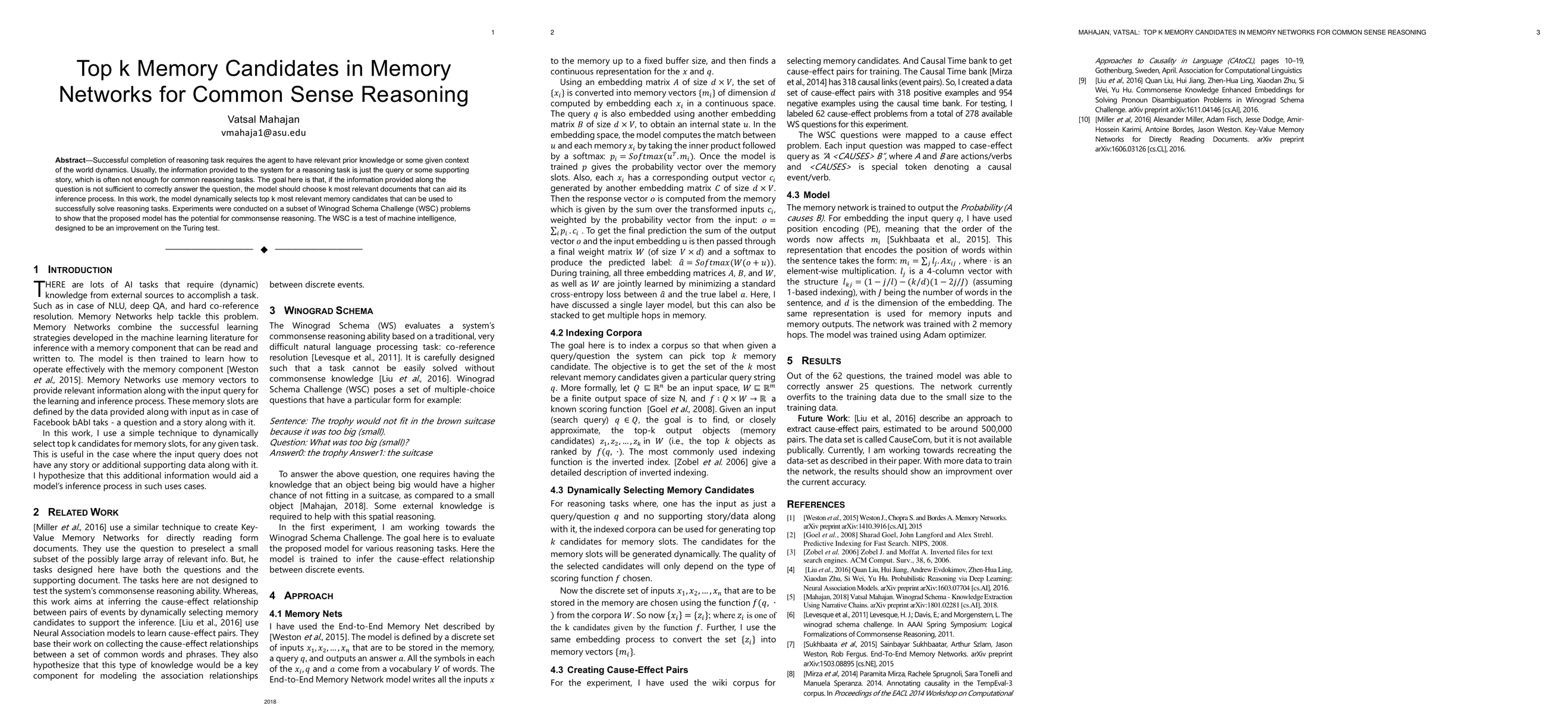 Successful completion of reasoning task requires the agent to have relevant prior knowledge or some given context of the world dynamics. Usually, the information provided to the system for a reasoning task is just the query or some supporting story, which is often not enough for common reasoning tasks. The goal here is that, if the information provided along the question is not sufficient to correctly answer the question, the model should choose k most relevant documents that can aid its inference process. In this work, the model dynamically selects top k most relevant memory candidates that can be used to successfully solve reasoning tasks. Experiments were conducted on a subset of Winograd Schema Challenge (WSC) problems to show that the proposed model has the potential for commonsense reasoning. The WSC is a test of machine intelligence, designed to be an improvement on the Turing test.