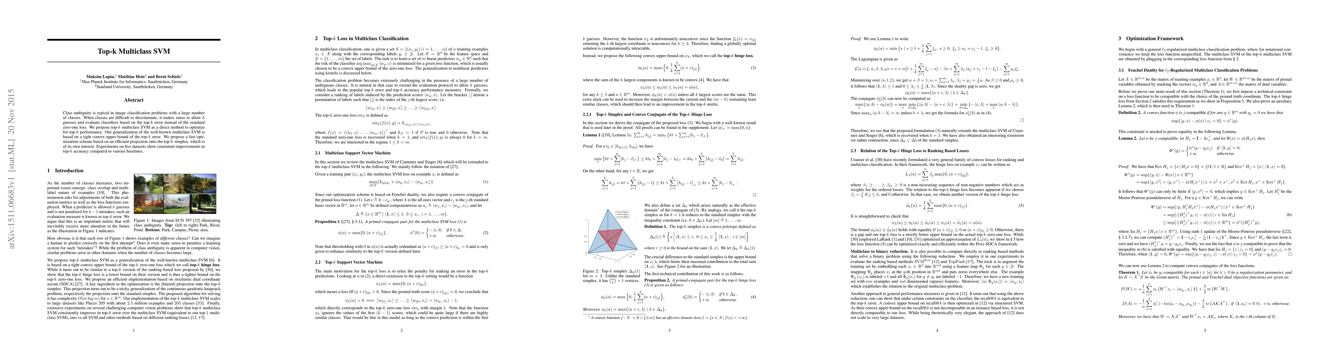 Class ambiguity is typical in image classification problems with a large number of classes. When classes are difficult to discriminate, it makes sense to allow k guesses and evaluate classifiers based on the top-k error instead of the standard zero-one loss. We propose top-k multiclass SVM as a direct method to optimize for top-k performance. Our generalization of the well-known multiclass SVM is based on a tight convex upper bound of the top-k error. We propose a fast optimization scheme based on an efficient projection onto the top-k simplex, which is of its own interest. Experiments on five datasets show consistent improvements in top-k accuracy compared to various baselines.