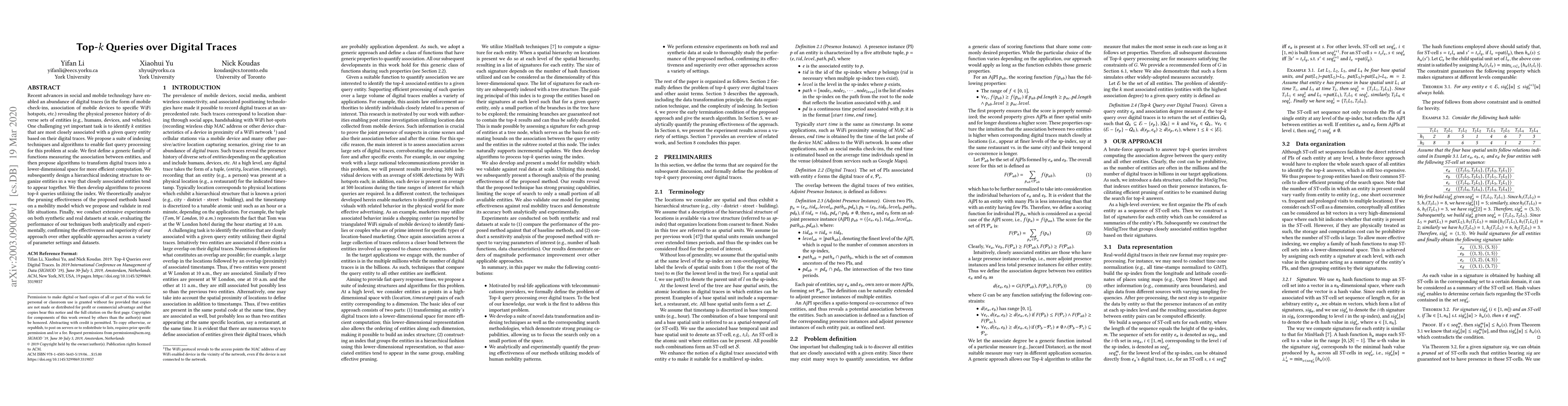 This paper proposes indexing techniques and algorithms to efficiently process top-k queries over digital traces, defining functions to measure entity association and transforming traces for lower-dimensional computation. The study validates the effectiveness of the proposed hierarchical indexing structure and algorithms through theoretical analysis and extensive experiments on both synthetic and real datasets.