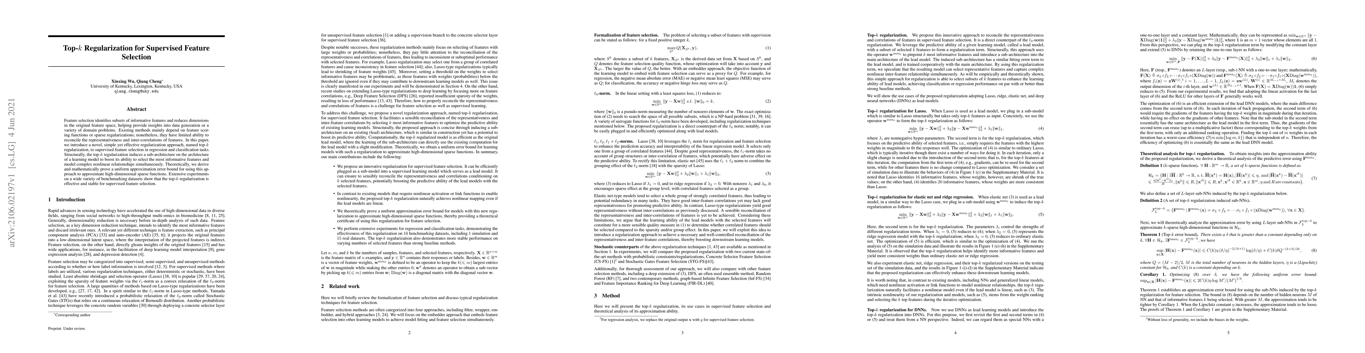 This paper introduces top-$k$ regularization for supervised feature selection, aiming to improve the selection of informative features while modeling complex relationships. The method is shown to be effective and stable through theoretical analysis and extensive experiments on various datasets.