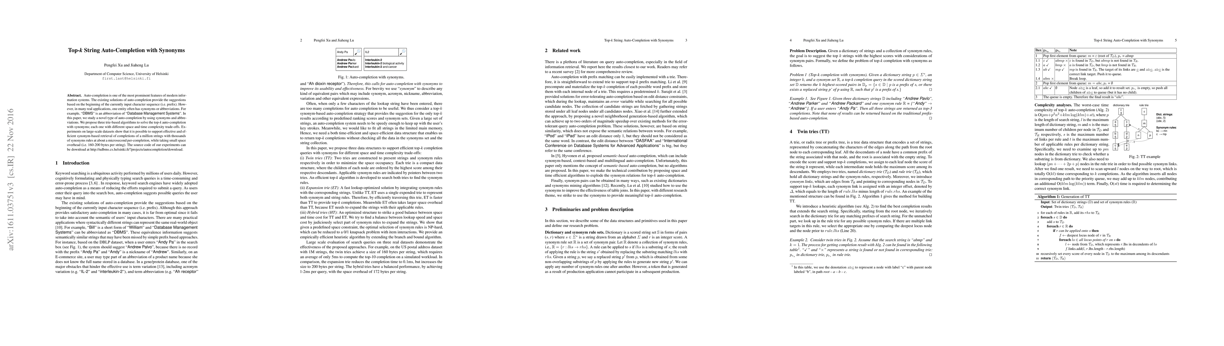 This paper proposes three trie-based algorithms for top-k string auto-completion that incorporate synonyms and abbreviations, achieving efficient retrieval with minimal space overhead. Experimental results demonstrate effective performance on large datasets, supporting a million strings with thousands of synonyms in microseconds.