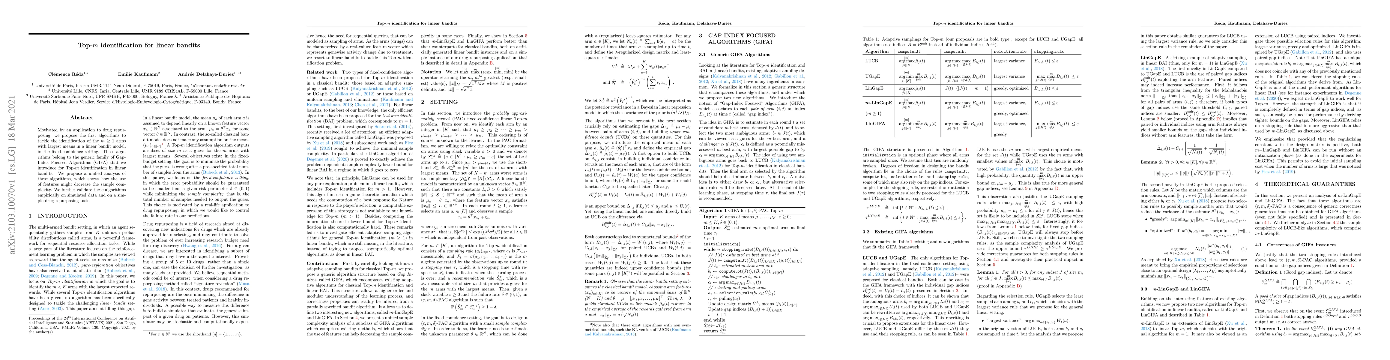 Motivated by an application to drug repurposing, we propose the first algorithms to tackle the identification of the m $\ge$ 1 arms with largest means in a linear bandit model, in the fixed-confidence setting. These algorithms belong to the generic family of Gap-Index Focused Algorithms (GIFA) that we introduce for Top-m identification in linear bandits. We propose a unified analysis of these algorithms, which shows how the use of features might decrease the sample complexity. We further validate these algorithms empirically on simulated data and on a simple drug repurposing task.