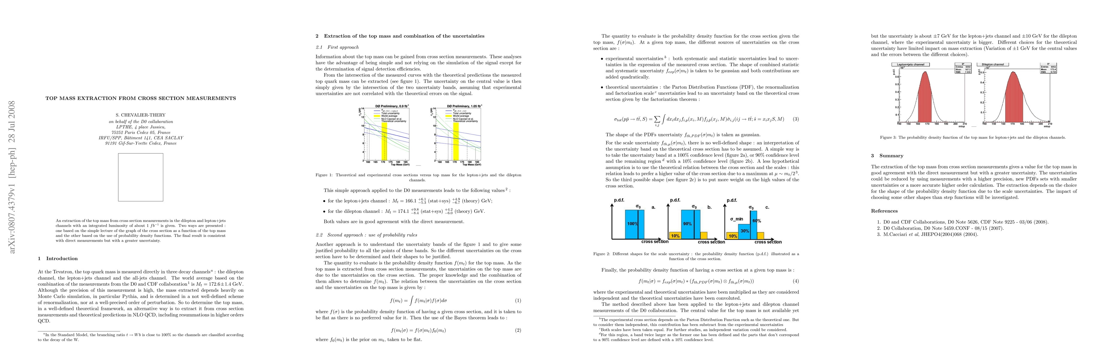 An extraction of the top mass from cross section measurements in the dilepton and lepton+jets channels with an integrated luminosity of about 1fb-1 is given. Two ways are presented : one based on the simple lecture of the graph of the cross section as a function of the top mass and the other based on the use of probability density functions. The final result is consistent with direct measurements but with a greater uncertainty.