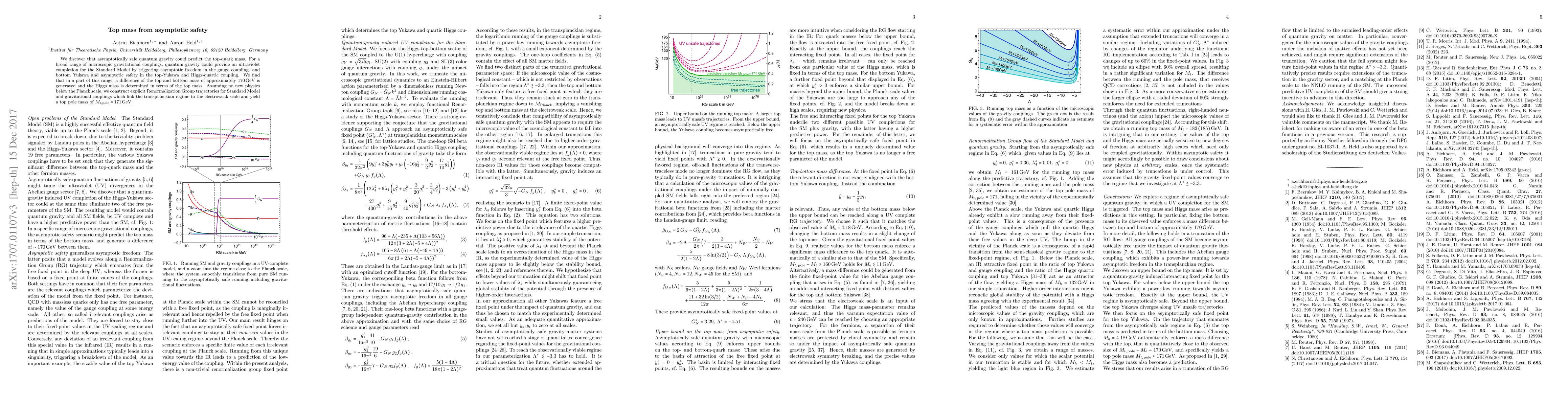Researchers found that asymptotic safety in quantum gravity predicts a top-quark mass difference of approximately 170 GeV, linking it to the Higgs mass, with a predicted top pole mass of 171 GeV.