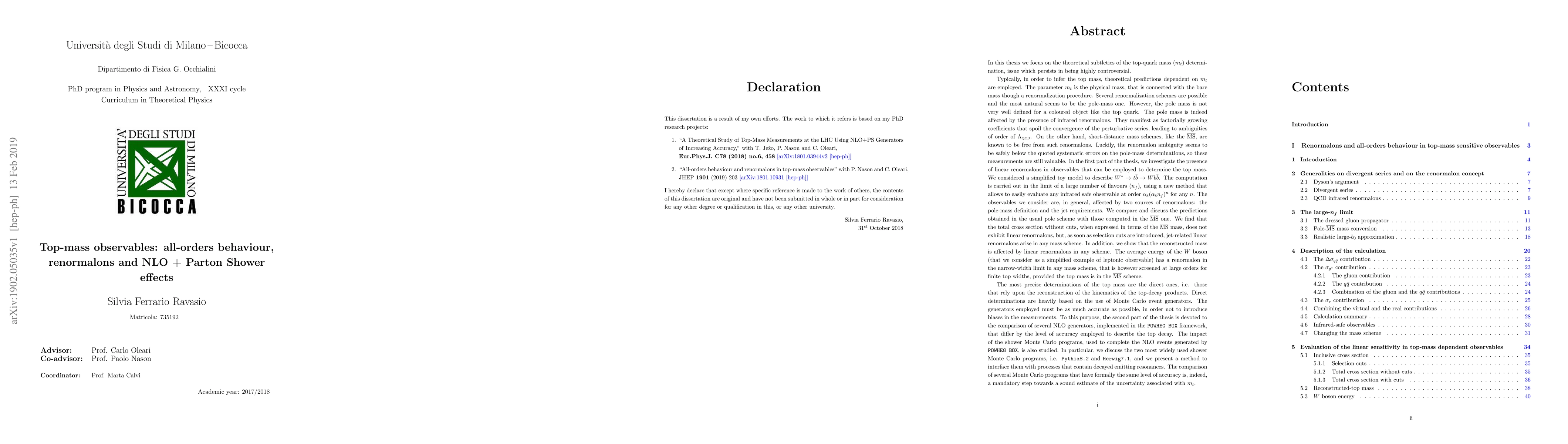 In this thesis we focus on the theoretical subtleties of the top-quark mass ($m_t$) determination, issue which persists in being highly controversial. In the first part of the thesis, we investigate the presence of linear renormalons in observables that can be employed to determine the top mass. We considered a simplified toy model to describe $W^{*} \rightarrow t \bar{b} \to Wb \bar{b}$. The computation is carried out in the limit of a large number of flavours ($n_f$), using a new method that allows to easily evaluate any infrared safe observable at order $\alpha_s(\alpha_s n_f)^n$ for any $n$. The second part of the thesis is devoted to the comparison of several NLO generators for top-pair production, implemented in the POWHEG BOX framework, that differ by the level of accuracy employed to describe the top decay. The impact of the shower Monte Carlo programs, used to complete the NLO events generated by POWHEG BOX, is also studied. In particular, we discuss the two most widely used shower Monte Carlo programs, i.e. Pythia 8.2 and Herwig 7.1, and we present a method to interface them with processes that contain decayed emitting resonances.