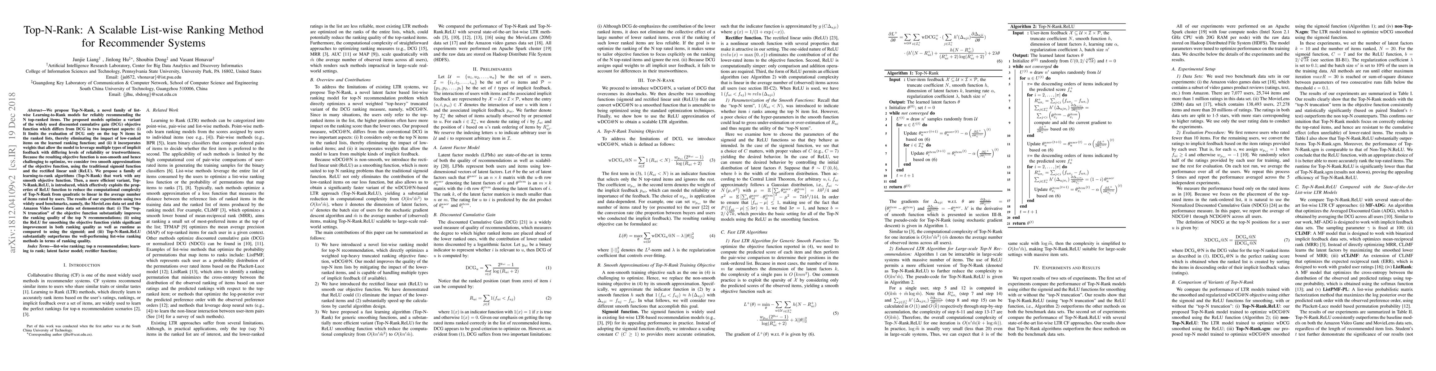 The paper introduces Top-N-Rank, a scalable list-wise ranking method for recommender systems that optimizes a truncated version of the DCG objective function to focus on the top N items, and leverages ReLU for efficient optimization. Experimental results show improved ranking quality and performance compared to existing methods.