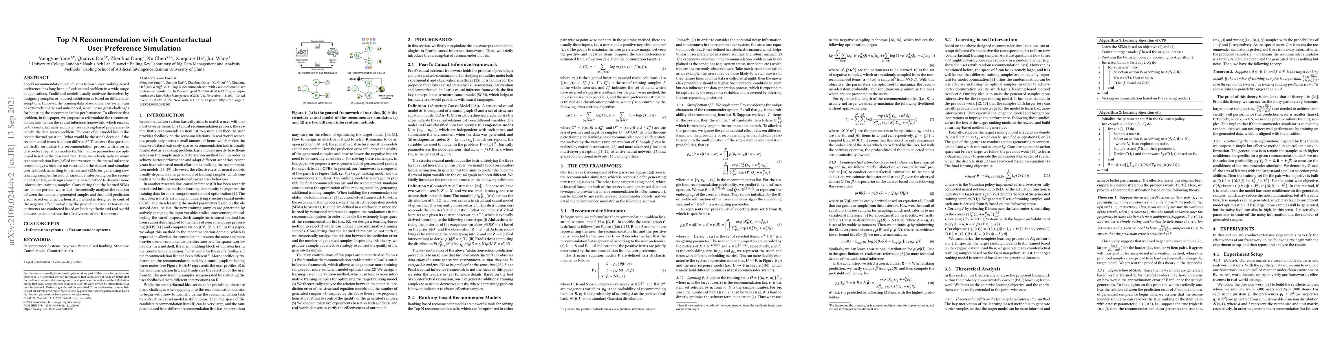 Top-N recommendation, which aims to learn user ranking-based preference, has long been a fundamental problem in a wide range of applications. Traditional models usually motivate themselves by designing complex or tailored architectures based on different assumptions. However, the training data of recommender system can be extremely sparse and imbalanced, which poses great challenges for boosting the recommendation performance. To alleviate this problem, in this paper, we propose to reformulate the recommendation task within the causal inference framework, which enables us to counterfactually simulate user ranking-based preferences to handle the data scarce problem. The core of our model lies in the counterfactual question: "what would be the user's decision if the recommended items had been different?". To answer this question, we firstly formulate the recommendation process with a series of structural equation models (SEMs), whose parameters are optimized based on the observed data. Then, we actively indicate many recommendation lists (called intervention in the causal inference terminology) which are not recorded in the dataset, and simulate user feedback according to the learned SEMs for generating new training samples. Instead of randomly intervening on the recommendation list, we design a learning-based method to discover more informative training samples. Considering that the learned SEMs can be not perfect, we, at last, theoretically analyze the relation between the number of generated samples and the model prediction error, based on which a heuristic method is designed to control the negative effect brought by the prediction error. Extensive experiments are conducted based on both synthetic and real-world datasets to demonstrate the effectiveness of our framework.