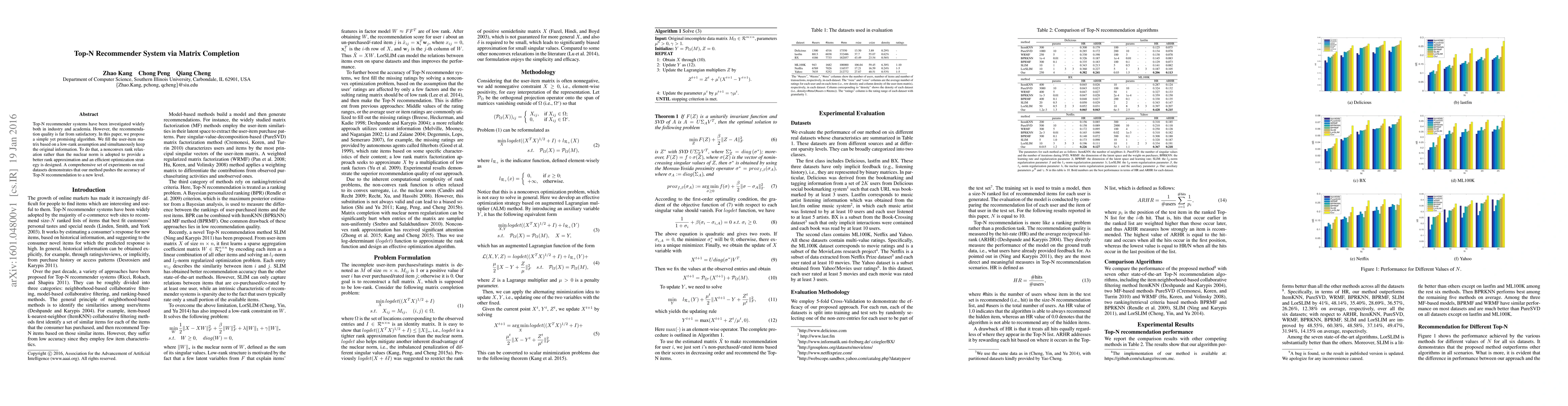 This paper proposes a novel algorithm for Top-N recommender systems using nonconvex rank relaxation for matrix completion, achieving higher recommendation accuracy compared to existing methods through a better rank approximation and efficient optimization strategy. Experimental results on real datasets show significant improvements in recommendation quality.