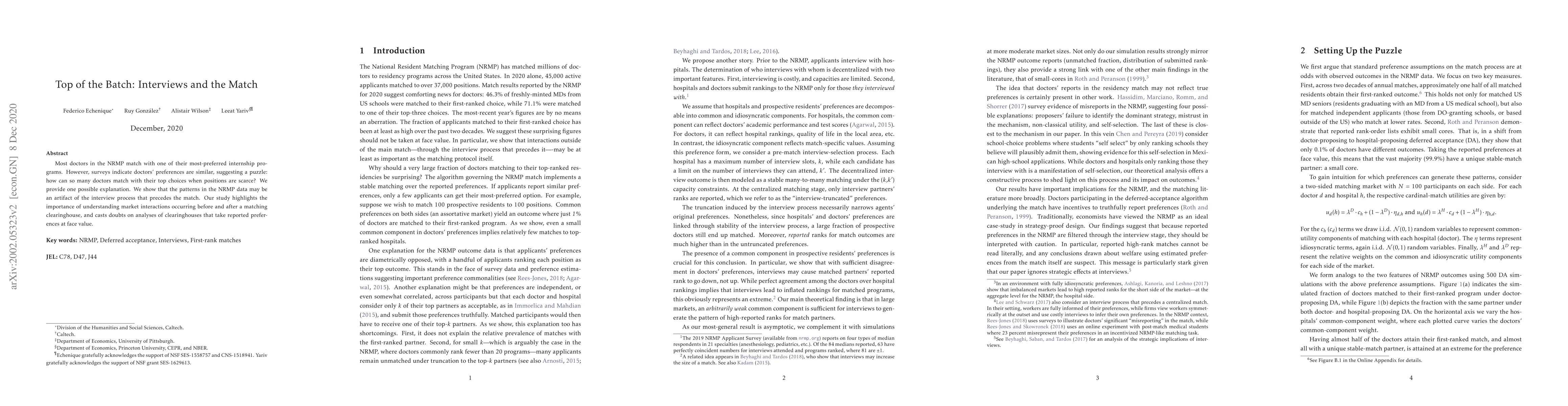 Most doctors in the NRMP are matched to one of their most-preferred internship programs. Since various surveys indicate similarities across doctors' preferences, this suggests a puzzle. How can nearly everyone get a position in a highly-desirable program when positions in each program are scarce? We provide one possible explanation for this puzzle. We show that the patterns observed in the NRMP data may be an artifact of the interview process that precedes the match. Our analysis highlights the importance of interactions occurring outside of a matching clearinghouse for resulting outcomes, and casts doubts on analysis of clearinghouses that take reported preferences at face value.