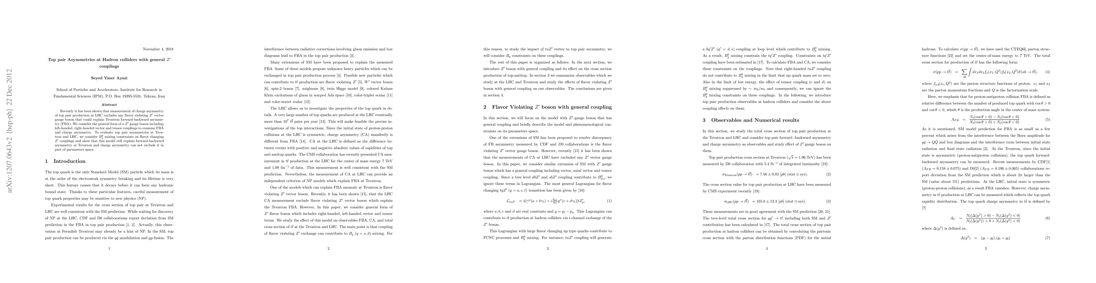 This paper investigates top pair asymmetries at hadron colliders with general $Z'$ couplings, demonstrating that while LHC measurements exclude flavor-violating $Z'$ bosons, a general model with $B^0_q$ mixing constraints can still explain the Tevatron's forward-backward asymmetry without being ruled out by charge asymmetry measurements.