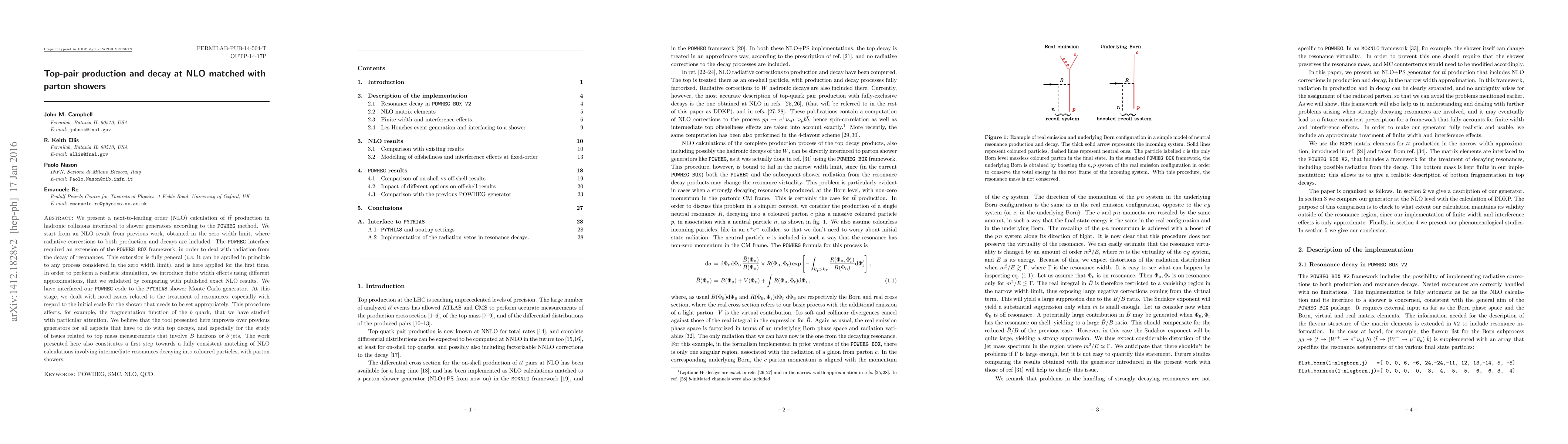 This paper presents a next-to-leading order (NLO) calculation of top-pair production in hadronic collisions, matched with parton showers using the POWHEG method. The authors extend the POWHEG BOX framework to handle decay radiation and interface it with PYTHIA8, addressing novel issues related to resonances and improving simulations of top decays and mass measurements.