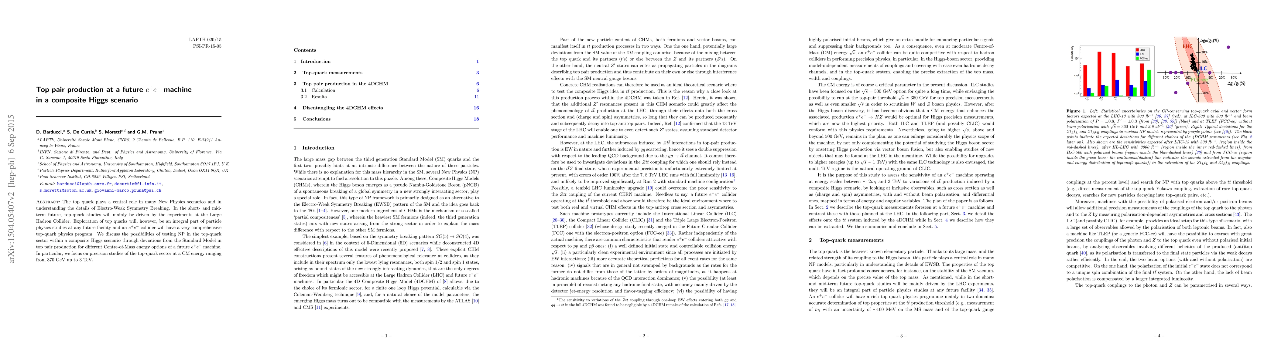 The top quark plays a central role in many New Physics scenarios and in understanding the details of Electro-Weak Symmetry Breaking. In the short- and mid-term future, top-quark studies will mainly be driven by the experiments at the Large Hadron Collider. Exploration of top quarks will, however, be an integral part of particle physics studies at any future facility and an $e^+ e^-$ collider will have a very comprehensive top-quark physics program. We discuss the possibilities of testing NP in the top-quark sector within a composite Higgs scenario through deviations from the Standard Model in top pair production for different Centre-of-Mass energy options of a future $e^+e^-$ machine. In particular, we focus on precision studies of the top-quark sector at a CM energy ranging from 370 GeV up to 3 TeV.