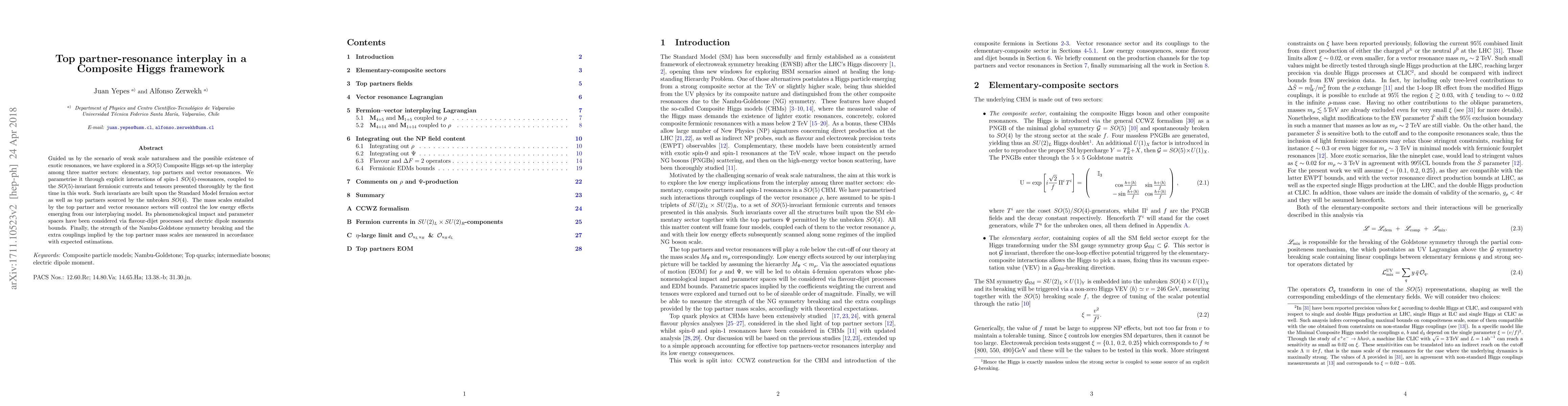 Guided us by the scenario of weak scale naturalness and the possible existence of exotic resonances, we have explored in a $SO(5)$ Composite Higgs set-up the interplay among three matter sectors: elementary, top partners and vector resonances. We parametrise it through explicit interactions of spin-1 $SO(4)$-resonances, coupled to the $SO(5)$-invariant fermionic currents and tensors presented in this work. Such invariants are built upon the Standard Model fermion sector as well as top partners sourced by the unbroken $SO(4)$. The mass scales entailed by the top partner and vector resonance sectors will control the low energy effects emerging from our interplaying model. Its phenomenological impact and parameter spaces have been considered via flavour-dijet processes and electric dipole moments bounds. Finally, the strength of the Nambu-Goldstone symmetry breaking and the extra couplings implied by the top partner mass scales are measured in accordance with expected estimations.