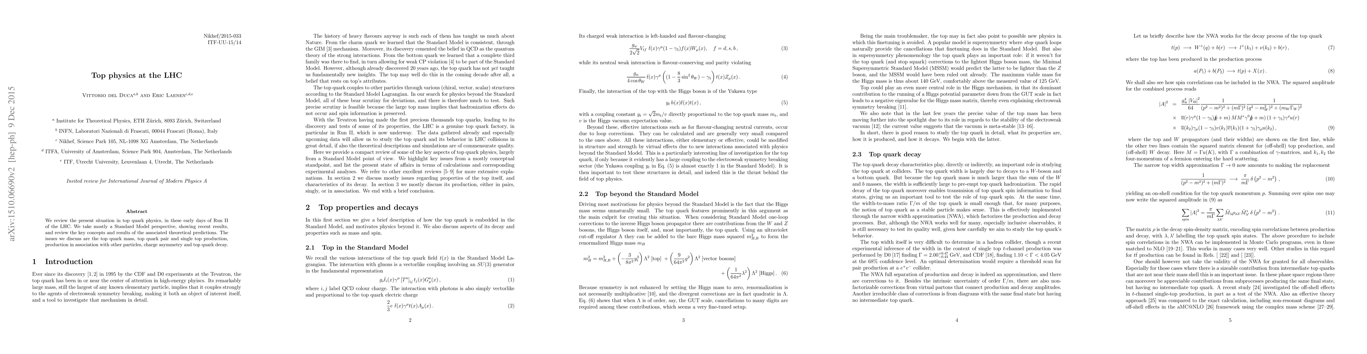 We review the present situation in top quark physics, in these early days of Run II of the LHC. We take mostly a Standard Model perspective, showing recent results, and review the key concepts and results of the associated theoretical predictions. The issues we discuss are the top quark mass, top quark pair and single top production, production in association with other particles, charge asymmetry and top quark decay.