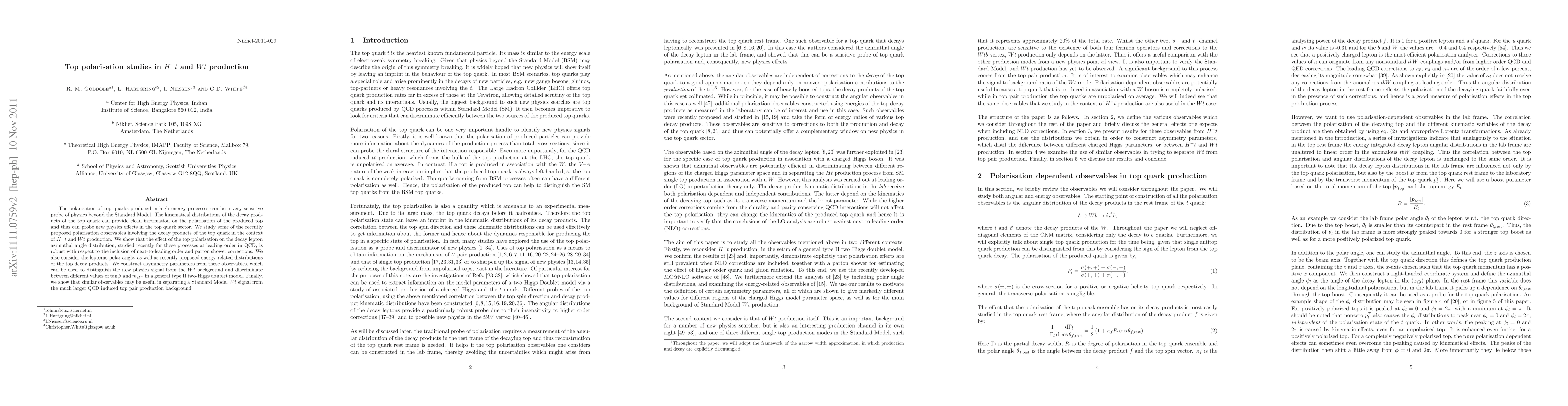 The polarisation of top quarks produced in high energy processes can be a very sensitive probe of physics beyond the Standard Model. The kinematical distributions of the decay products of the top quark can provide clean information on the polarisation of the produced top and thus can probe new physics effects in the top quark sector. We study some of the recently proposed polarisation observables involving the decay products of the top quark in the context of $H^-t$ and $Wt$ production. We show that the effect of the top polarisation on the decay lepton azimuthal angle distribution, studied recently for these processes at leading order in QCD, is robust with respect to the inclusion of next-to-leading order and parton shower corrections. We also consider the leptonic polar angle, as well as recently proposed energy-related distributions of the top decay products. We construct asymmetry parameters from these observables, which can be used to distinguish the new physics signal from the $Wt$ background and discriminate between different values of $\tan\beta$ and $m_{H^-}$ in a general type II two-Higgs doublet model. Finally, we show that similar observables may be useful in separating a Standard Model $Wt$ signal from the much larger QCD induced top pair production background.