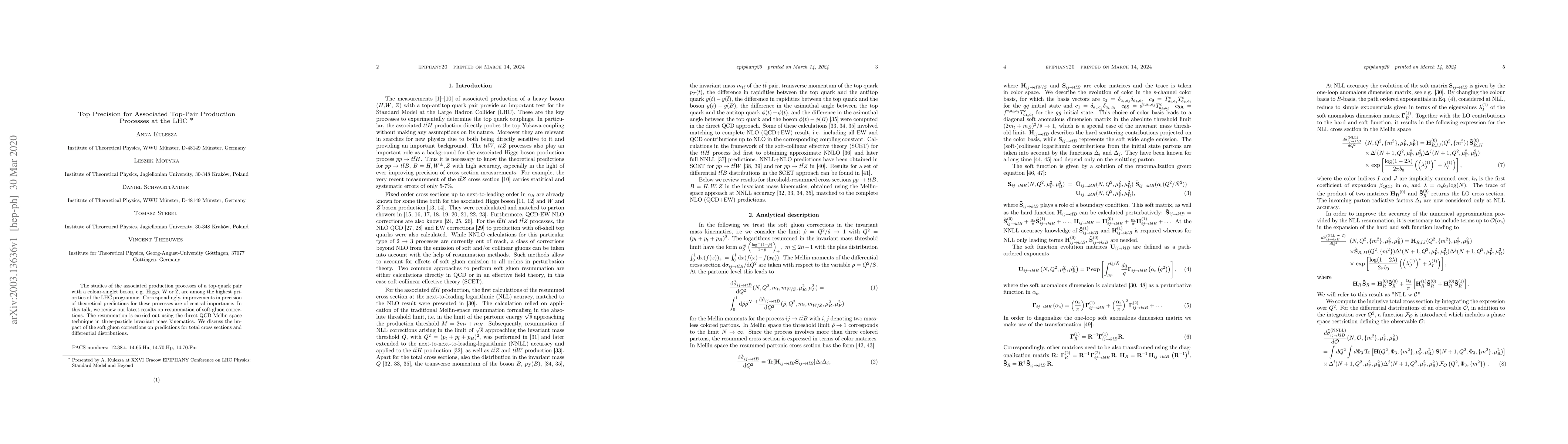 The studies of the associated production processes of a top-quark pair with a colour-singlet boson, e.g. Higgs, W or Z, are among the highest priorities of the LHC programme. Correspondingly, improvements in precision of theoretical predictions for these processes are of central importance. In this talk, we review our latest results on resummation of soft gluon corrections. The resummation is carried out using the direct QCD Mellin space technique in three-particle invariant mass kinematics. We discuss the impact of the soft gluon corrections on predictions for total cross sections and differential distributions.