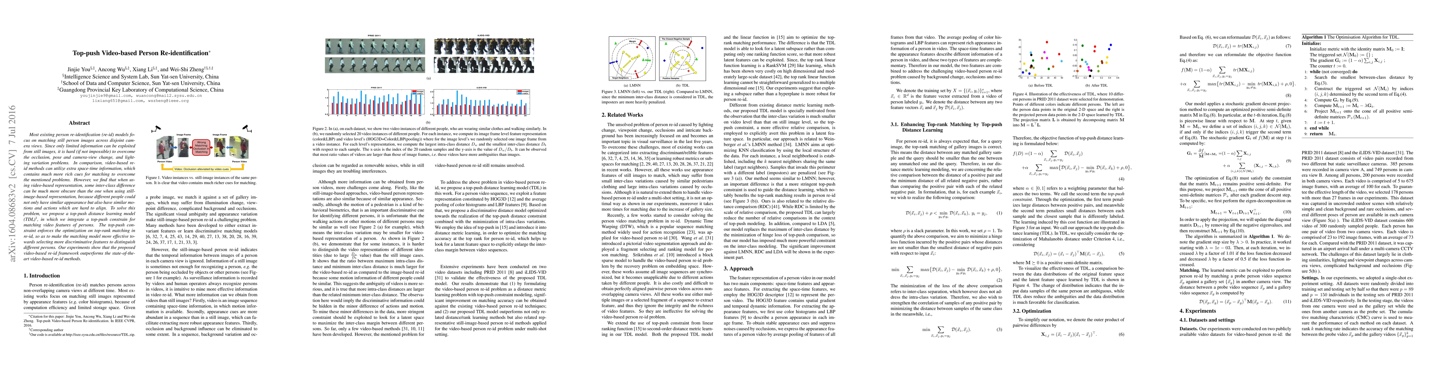 This paper proposes a top-push distance learning model (TDL) for video-based person re-identification, integrating a top-push constraint to enhance the selection of discriminative features, thereby improving the accuracy of matching despite challenges like occlusion and pose changes. The proposed method outperforms existing video-based re-id techniques.