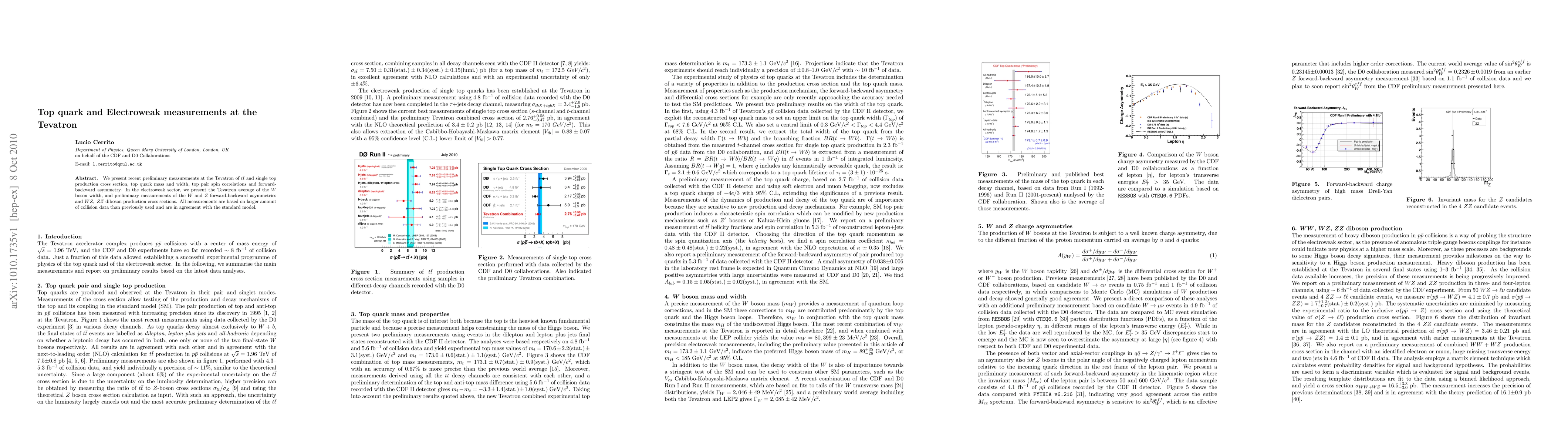 This paper reports preliminary measurements from the Tevatron on top quark and electroweak processes, including top pair production, top quark mass, and forward-backward asymmetries, all consistent with the Standard Model. It also presents the Tevatron average for W boson width and initial findings on W and Z boson asymmetries and diboson production.