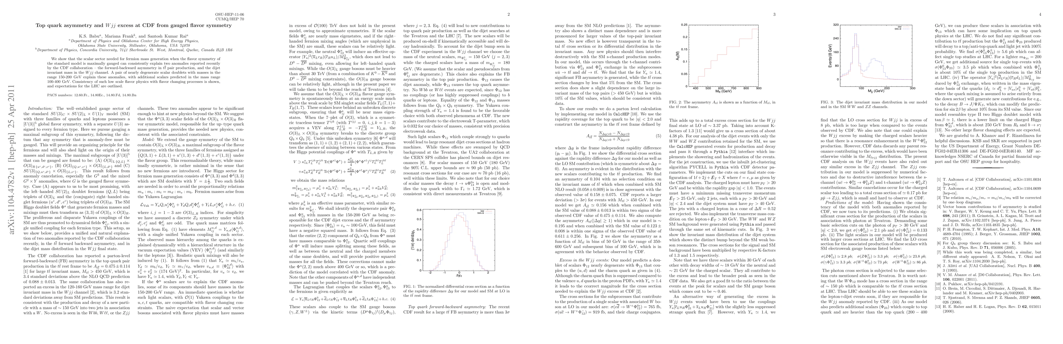 We show that the scalar sector needed for fermion mass generation when the flavor symmetry of the standard model is maximally gauged can consistently explain two anomalies reported recently by the CDF collaboration - the forward-backward asymmetry in t-tbar pair production, and the dijet invariant mass in the Wjj channel. A pair of nearly degenerate scalar doublets with masses in the range 150-200 GeV explain these anomalies, with additional scalars predicted in the mass range 100-400 GeV. Consistency of such low scale flavor physics with flavor changing processes is shown, and expectations for the LHC are outlined.