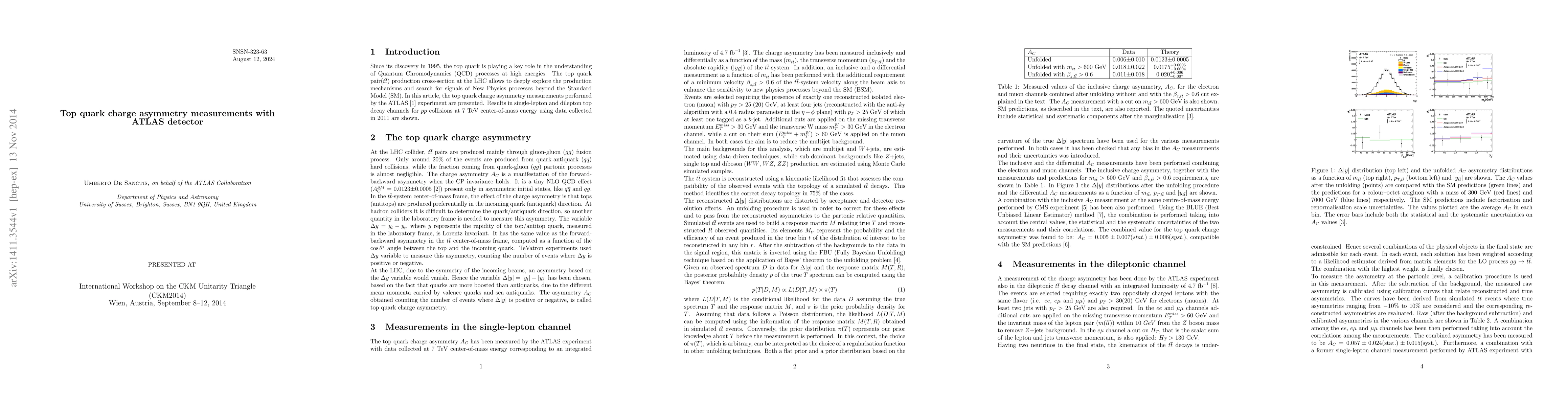 Summary: This paper reports on the measurements of top quark charge asymmetry using the ATLAS detector at a 7 TeV center-of-mass energy, providing insights into the properties of the top quark and testing the Standard Model of particle physics.