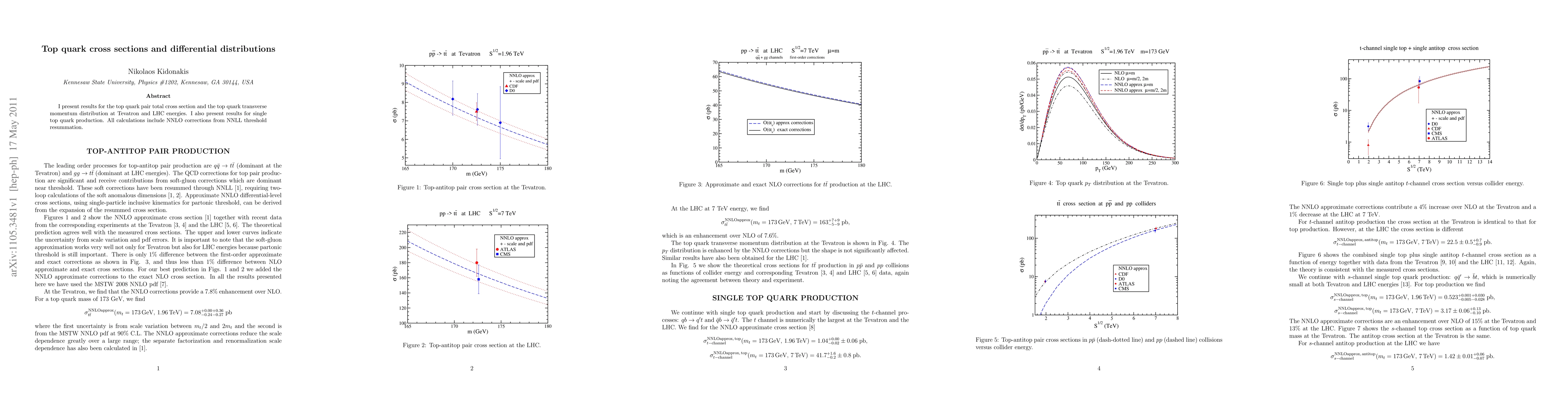 This paper reports on top quark pair production cross sections and differential distributions, including single top quark production, at Tevatron and LHC energies, with calculations incorporating next-to-next-to-leading order corrections from NNLL threshold resummation.