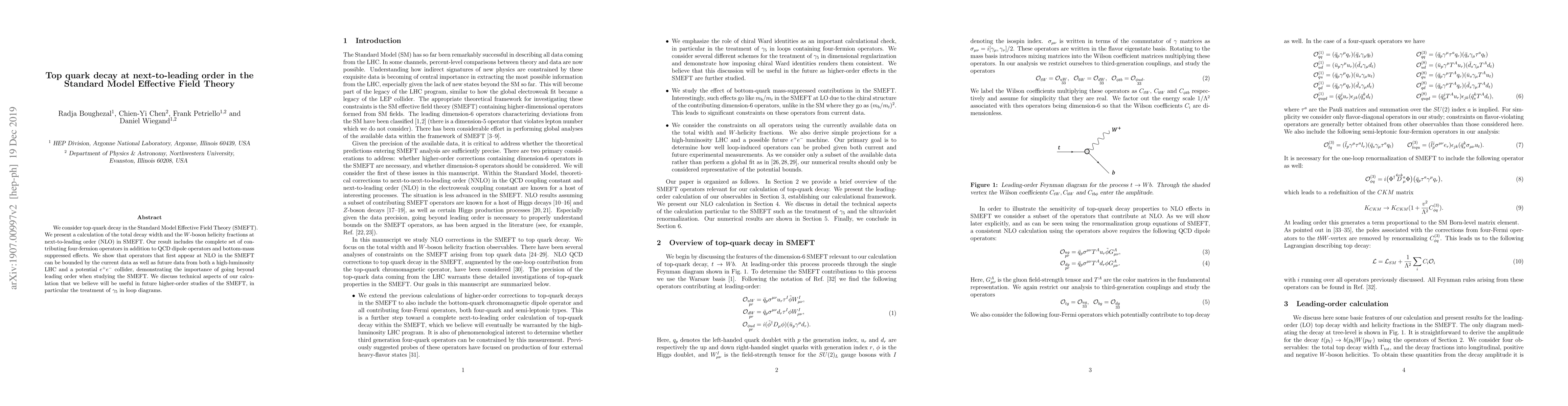 We consider top quark decay in the Standard Model Effective Field Theory (SMEFT). We present a calculation of the total decay width and the $W$-boson helicity fractions at next-to-leading order (NLO) in SMEFT. Our result includes the complete set of contributing four-fermion operators in addition to QCD dipole operators and bottom-mass suppressed effects. We show that operators that first appear at NLO in the SMEFT can be bounded by the current data as well as future data from both a high-luminosity LHC and a potential $e^+e^-$ collider, demonstrating the importance of going beyond leading order when studying the SMEFT. We discuss technical aspects of our calculation that we believe will be useful in future higher-order studies of the SMEFT, in particular the treatment of $\gamma_5$ in loop diagrams.