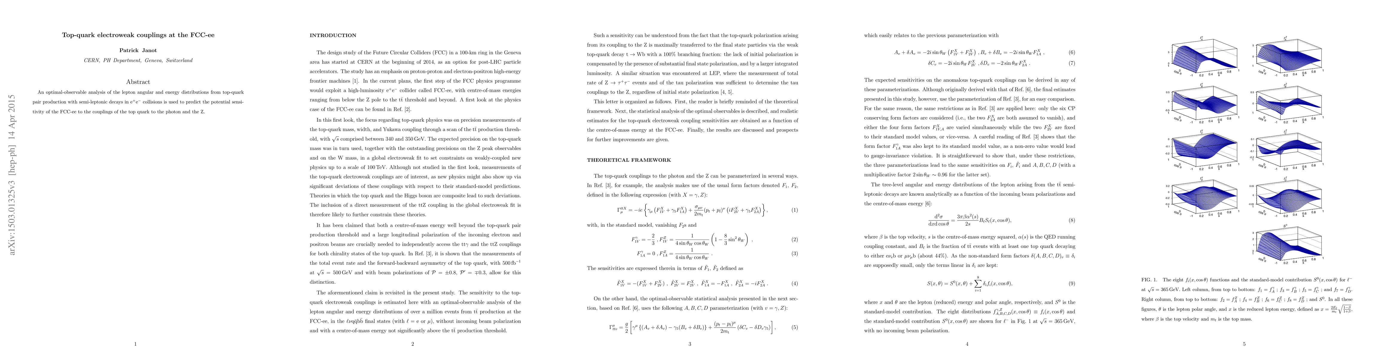 An optimal-observable analysis of the lepton angular and energy distributions from top-quark pair production with semi-leptonic decays in e+e- collisions is used to predict the potential sensitivity of the FCC-ee to the couplings of the top quark to the photon and the Z.