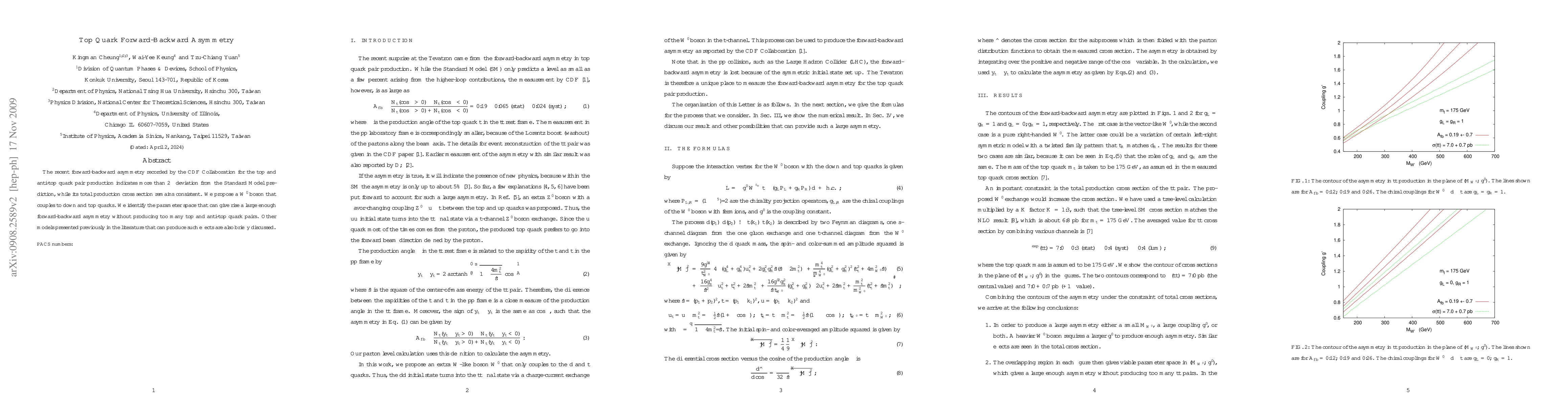 The CDF Collaboration reports a $2\sigma$ deviation in top quark forward-backward asymmetry from Standard Model predictions, while the total production cross section aligns. A proposed $W'$ boson coupling to down and top quarks offers a potential explanation for this asymmetry within a specific parameter space.