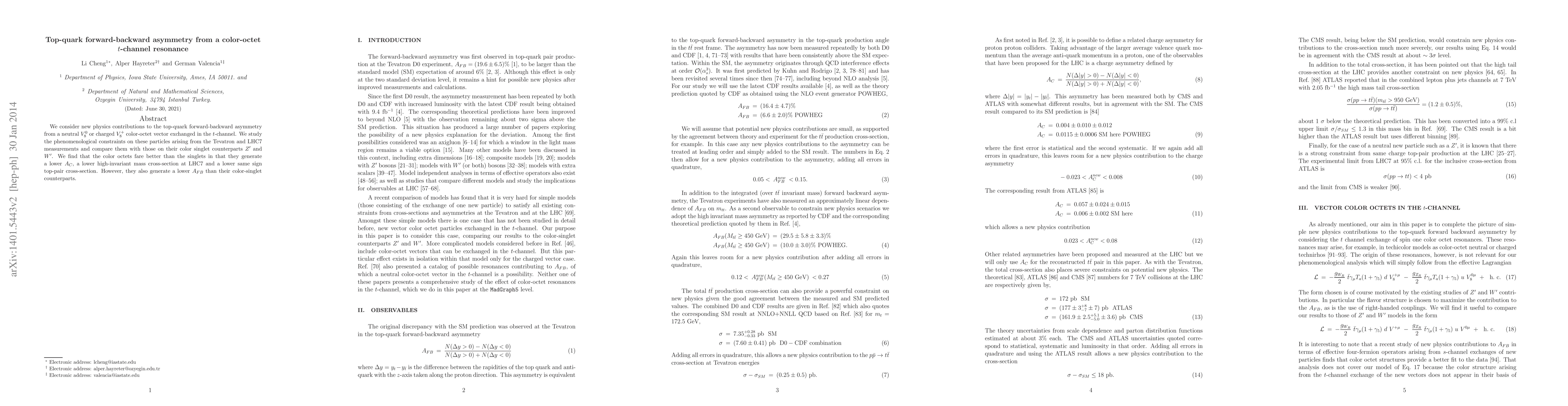 This paper investigates new physics contributions to the top-quark forward-backward asymmetry via color-octet vector resonances in the $t$-channel. It finds that these color octets generate lower asymmetries and cross-sections compared to their color singlet counterparts, though they also produce a lower forward-backward asymmetry.