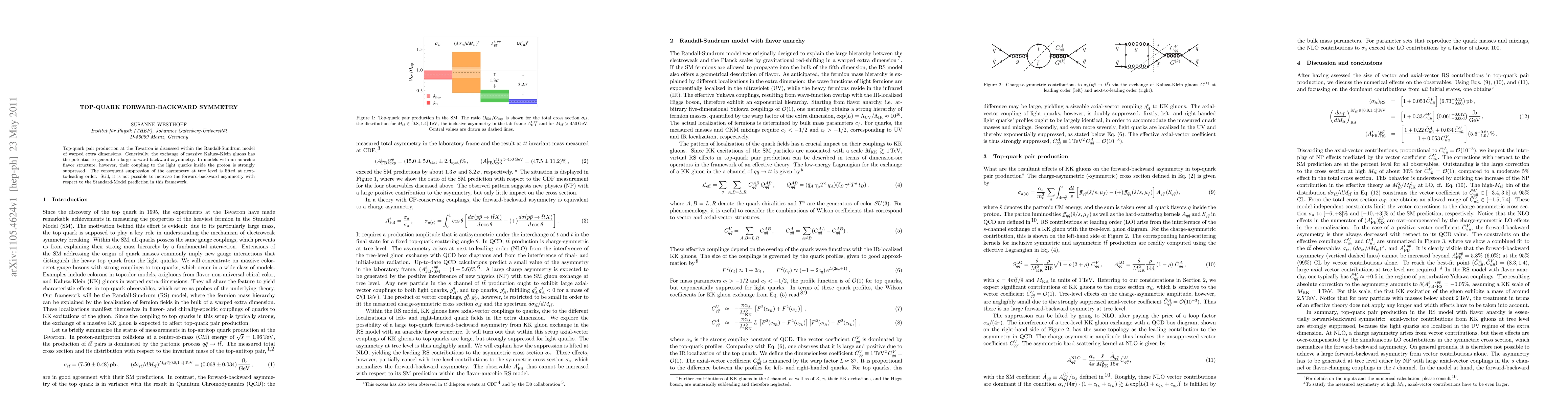 This paper examines top-quark pair production at the Tevatron under the Randall-Sundrum model, finding that while Kaluza-Klein gluons could generate significant forward-backward asymmetry, anarchic flavor structure suppresses these effects. Despite next-to-leading order corrections, the asymmetry remains below Standard-Model predictions.