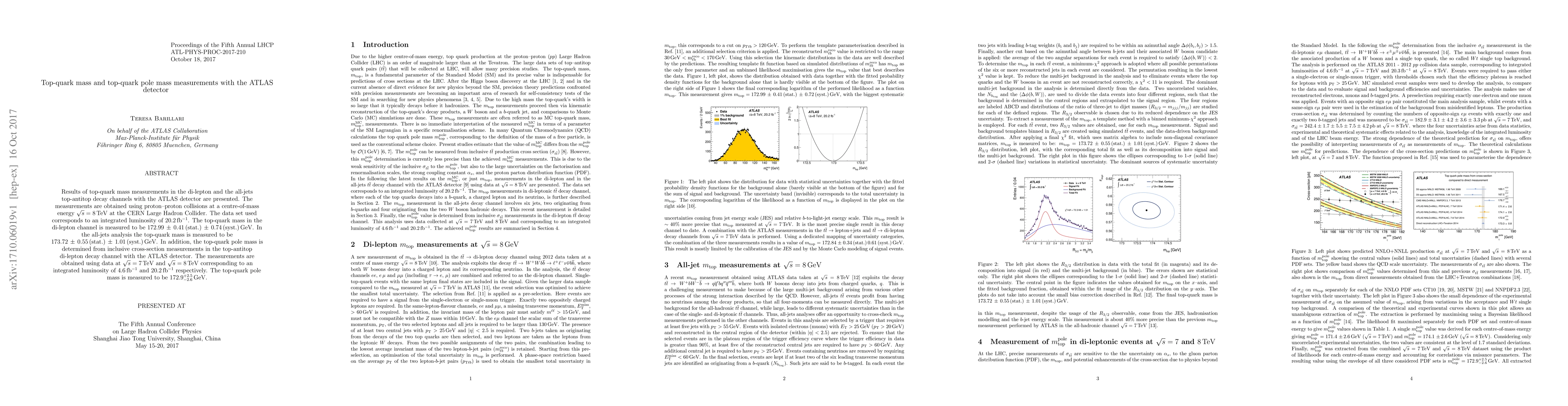 This paper presents top-quark mass measurements in the di-lepton and all-jets decay channels using the ATLAS detector at the LHC, finding masses of 172.99 ± 0.41 ± 0.74 GeV and 173.72 ± 0.55 ± 1.01 GeV respectively, and determines the top-quark pole mass to be 172.9 ± 2.5 GeV.