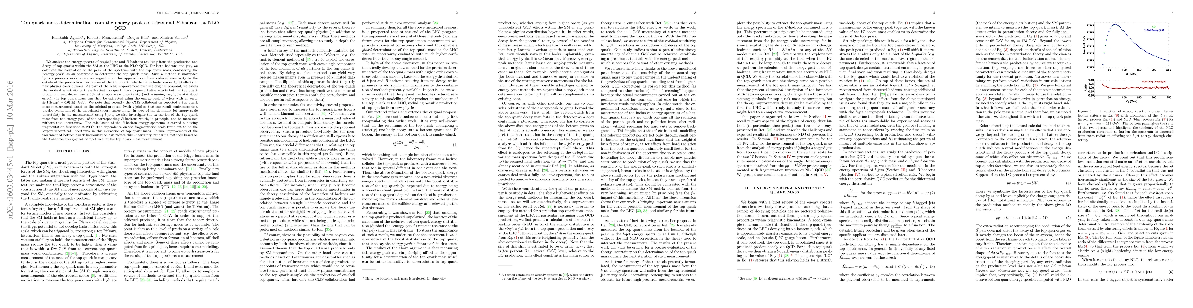 This paper investigates the determination of the top quark mass using the energy peaks of b-jets and B-hadrons at the LHC, employing NLO QCD calculations. The method shows reduced sensitivity to production details and achieves a precision of ±(1.2 exp + 0.6 theo) GeV for b-jets, while B-hadrons offer potential without jet energy scale uncertainties, though they currently face larger theoretical uncertainties due to fragmentation scale dependence.