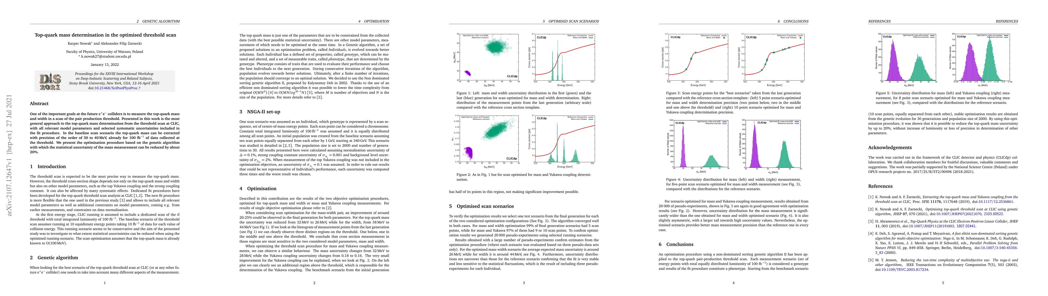 One of the important goals at the future e$^+$e$^-$ colliders is to measure the top-quark mass and width in a scan of the pair production threshold. Presented in this work is the most general approach to the top-quark mass determination from the threshold scan at CLIC, with all relevant model parameters and selected systematic uncertainties included in the fit procedure. In the baseline scan scenario the top-quark mass can be extracted with precision of the order of 30 to 40 MeV, already for 100 fb$^{-1}$ of data collected at the threshold. We present the optimisation procedure based on the genetic algorithm with which the statistical uncertainty of the mass measurement can be reduced by about 20%.