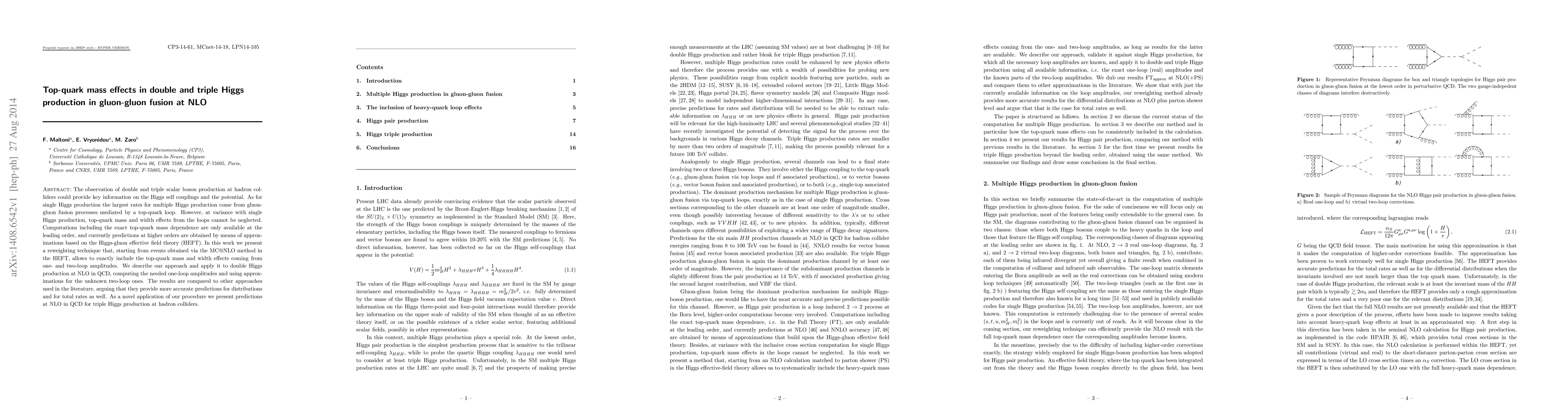 The observation of double and triple scalar boson production at hadron colliders could provide key information on the Higgs self couplings and the potential. As for single Higgs production the largest rates for multiple Higgs production come from gluon-gluon fusion processes mediated by a top-quark loop. However, at variance with single Higgs production, top-quark mass and width effects from the loops cannot be neglected. Computations including the exact top-quark mass dependence are only available at the leading order, and currently predictions at higher orders are obtained by means of approximations based on the Higgs-gluon effective field theory (HEFT). In this work we present a reweighting technique that, starting from events obtained via the MC@NLO method in the HEFT, allows to exactly include the top-quark mass and width effects coming from one- and two-loop amplitudes. We describe our approach and apply it to double Higgs production at NLO in QCD, computing the needed one-loop amplitudes and using approximations for the unknown two-loop ones. The results are compared to other approaches used in the literature, arguing that they provide more accurate predictions for distributions and for total rates as well. As a novel application of our procedure we present predictions at NLO in QCD for triple Higgs production at hadron colliders.