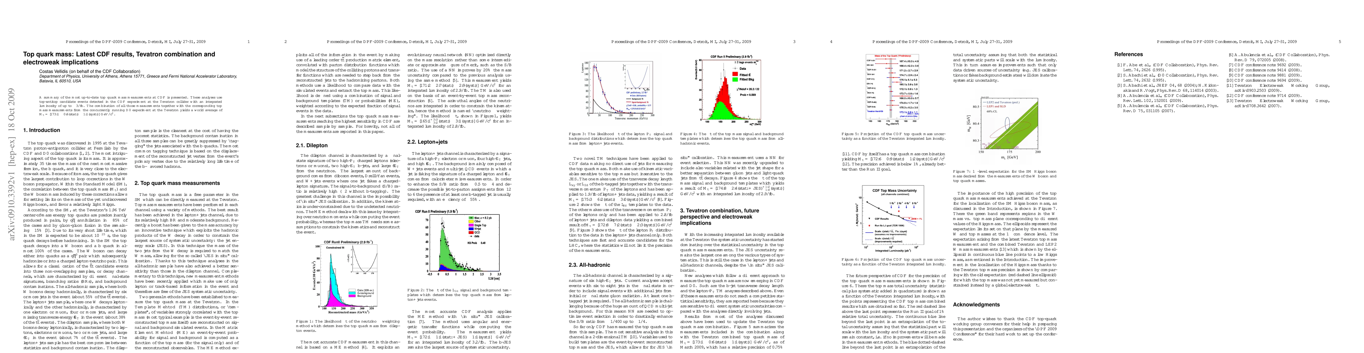 The CDF experiment has combined top quark mass measurements from over 3/fb of data, yielding a world average of M_t=173.1 GeV/c^2 with an uncertainty of +/-0.6(stat.) and +/-1.1(syst.).