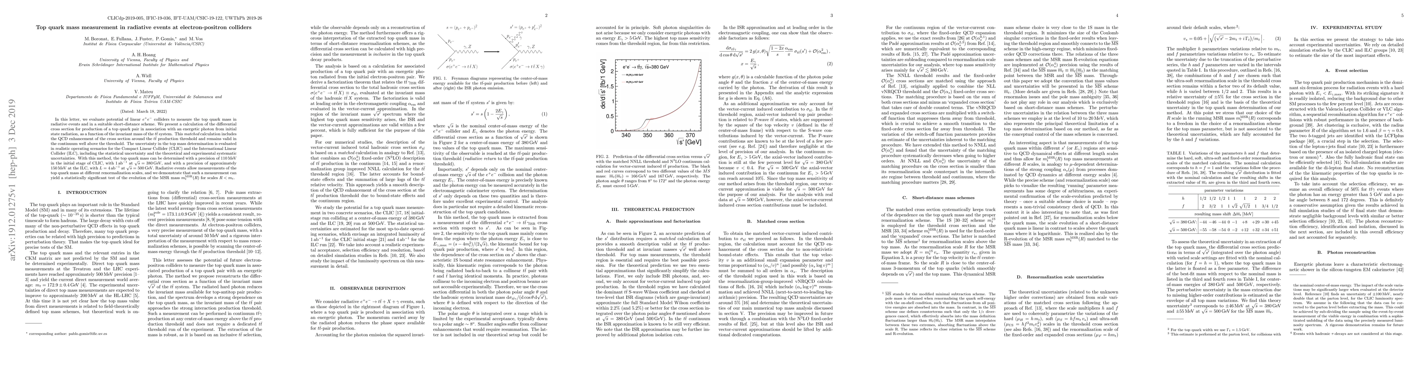 In this letter, we evaluate potential of linear $e^+e^-$ colliders to measure the top quark mass in radiative events and in a suitable short-distance scheme. We present a calculation of the differential cross section for production of a top quark pair in association with an energetic photon from initial state radiation, as a function of the invariant mass of the $t\bar{t}$ system. This {\it matched} calculation includes the QCD enhancement of the cross section around the $t\bar{t}$ production threshold and remains valid in the continuum well above the threshold. The uncertainty in the top mass determination is evaluated in realistic operating scenarios for the Compact Linear Collider (CLIC) and the International Linear Collider (ILC), including the statistical uncertainty and the theoretical and experimental systematic uncertainties. With this method, the top quark mass can be determined with a precision of $110$ MeV in the initial stage of CLIC, with $1$ ab$^{-1}$ at $\sqrt{s} =$ 380 GeV, and with a precision of approximately $150$ MeV at the ILC, with $L = 4$ ab$^{-1}$ at $\sqrt{s}= 500$ GeV. Radiative events allow measurements of the top quark mass at different renormalization scales, and we demonstrate that such a measurement can yield a statistically significant test of the evolution of the MSR mass $m_t^{\rm MSR}(R)$ for scales $R< m_t$.
