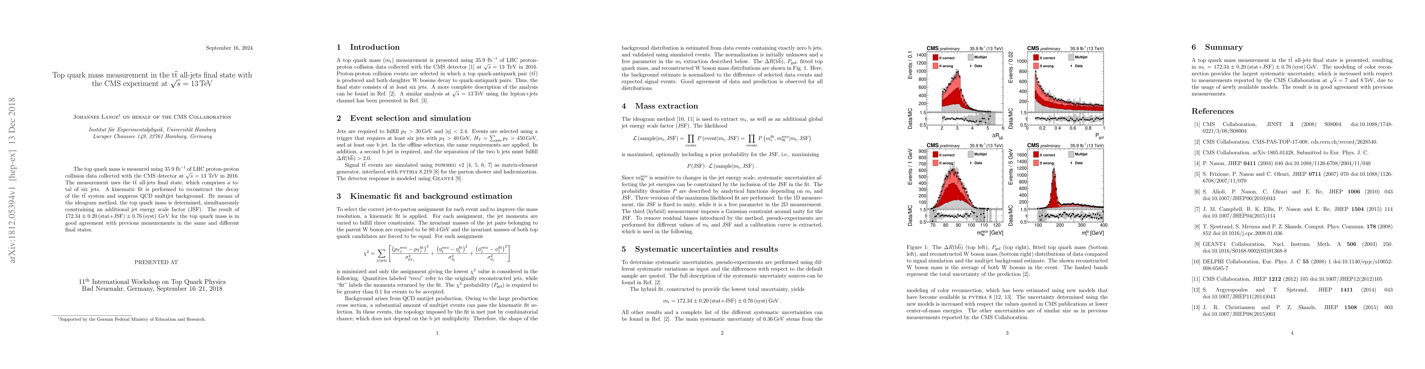 This paper reports a top quark mass measurement using $35.9~\mathrm{fb}^{-1}$ of LHC data collected by the CMS experiment at $\sqrt{s}=13~\mathrm{TeV}$. The $\mathrm{t}\overline{\mathrm{t}}$ all-jets final state is analyzed, yielding a top quark mass of $172.34\pm0.20\,\text{(stat+JSF)}\pm0.76\,\text{(syst)}~\mathrm{GeV}$.