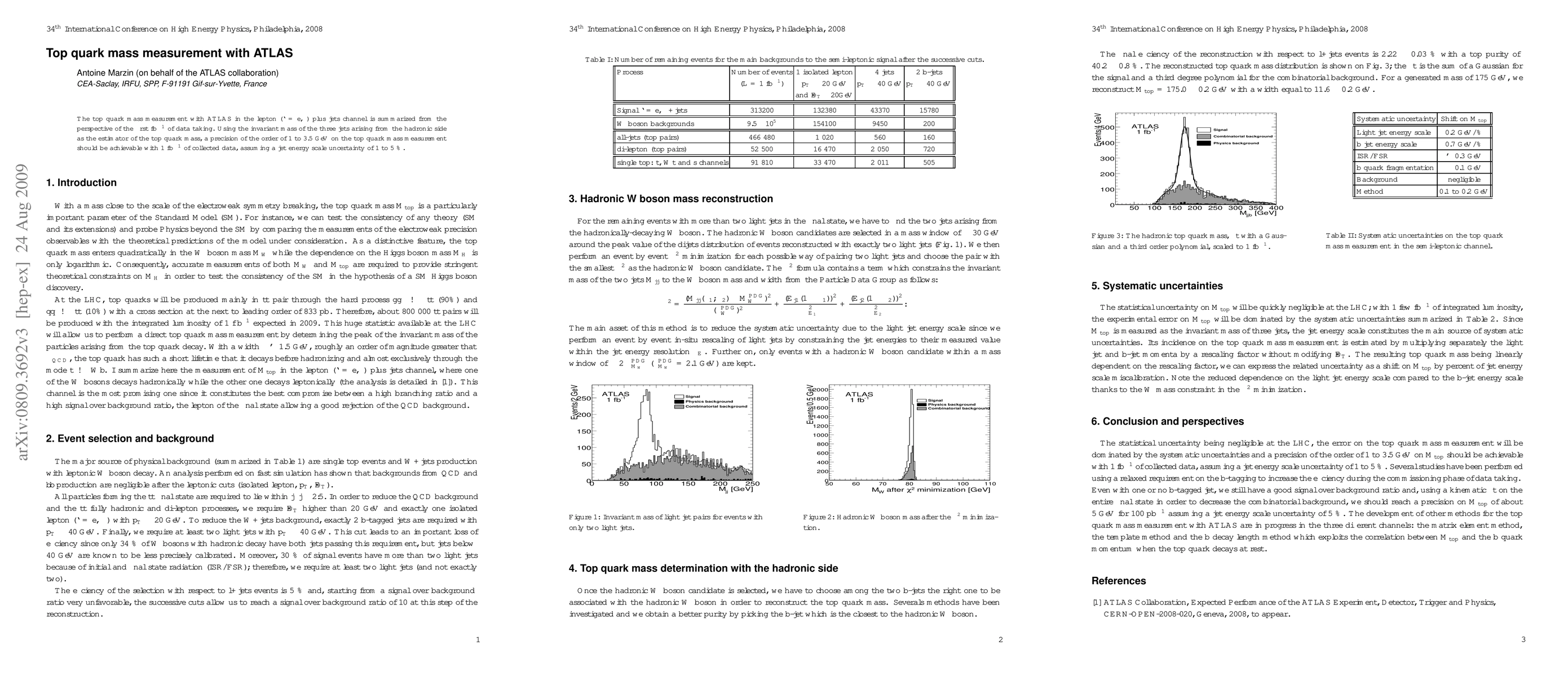 The ATLAS collaboration reports on the measurement of the top quark mass in the lepton plus jets channel using early data, achieving a precision of 1 to 3.5 GeV, with uncertainties primarily stemming from jet energy scale.