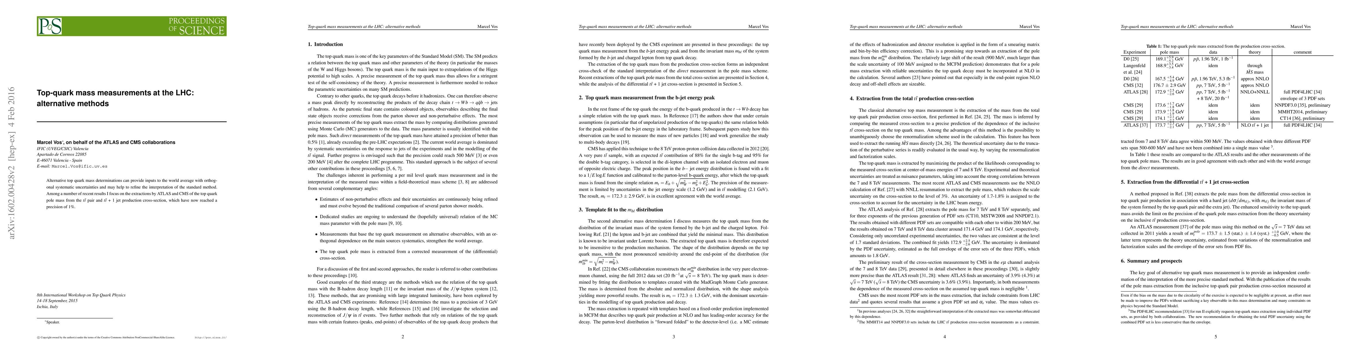 This paper discusses alternative methods for determining the top quark mass at the LHC, focusing on recent results from ATLAS and CMS that achieve 1% precision by analyzing top quark pair and tt + 1 jet production cross-sections. These methods offer orthogonal systematic uncertainties compared to the standard approach.