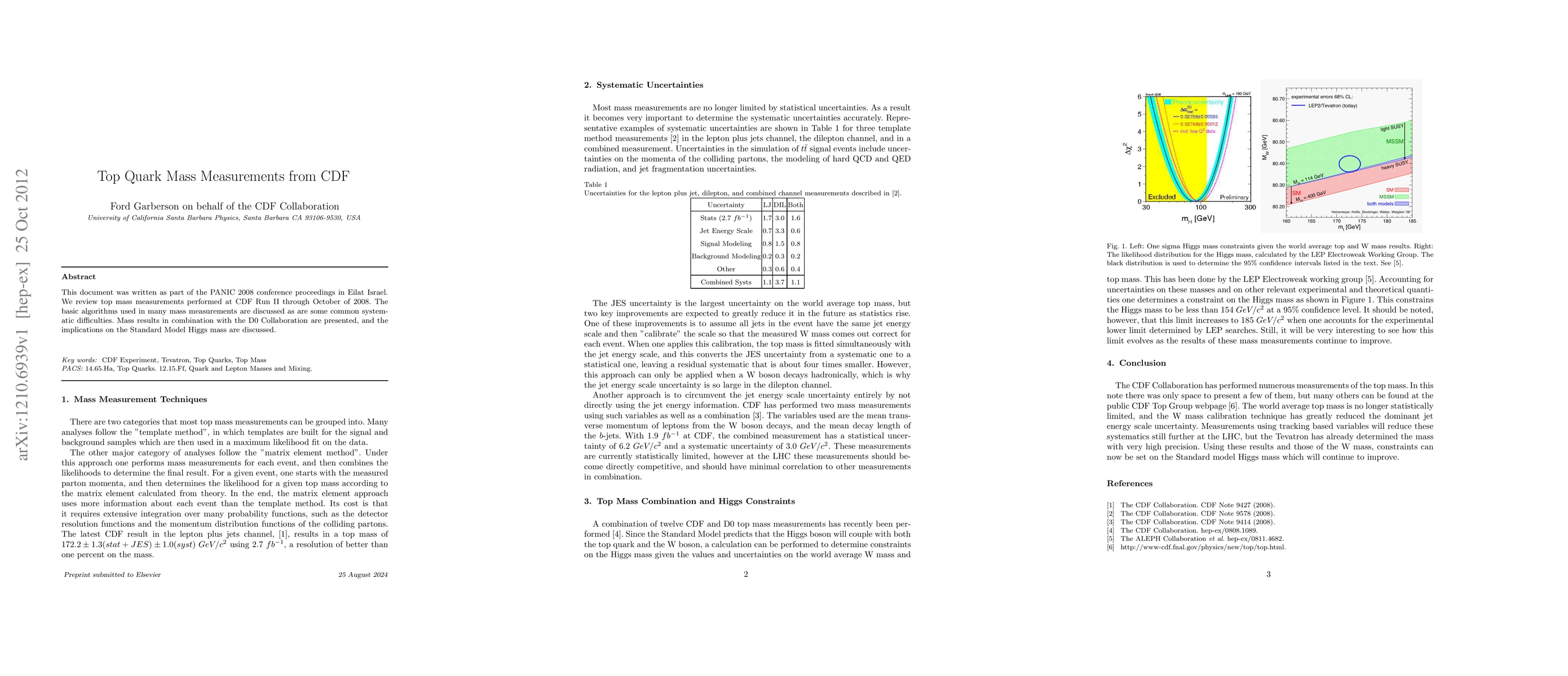 The CDF Run II collaboration reports on top quark mass measurements from 2008, combining results with the D0 Collaboration to provide insights into the Standard Model Higgs mass.